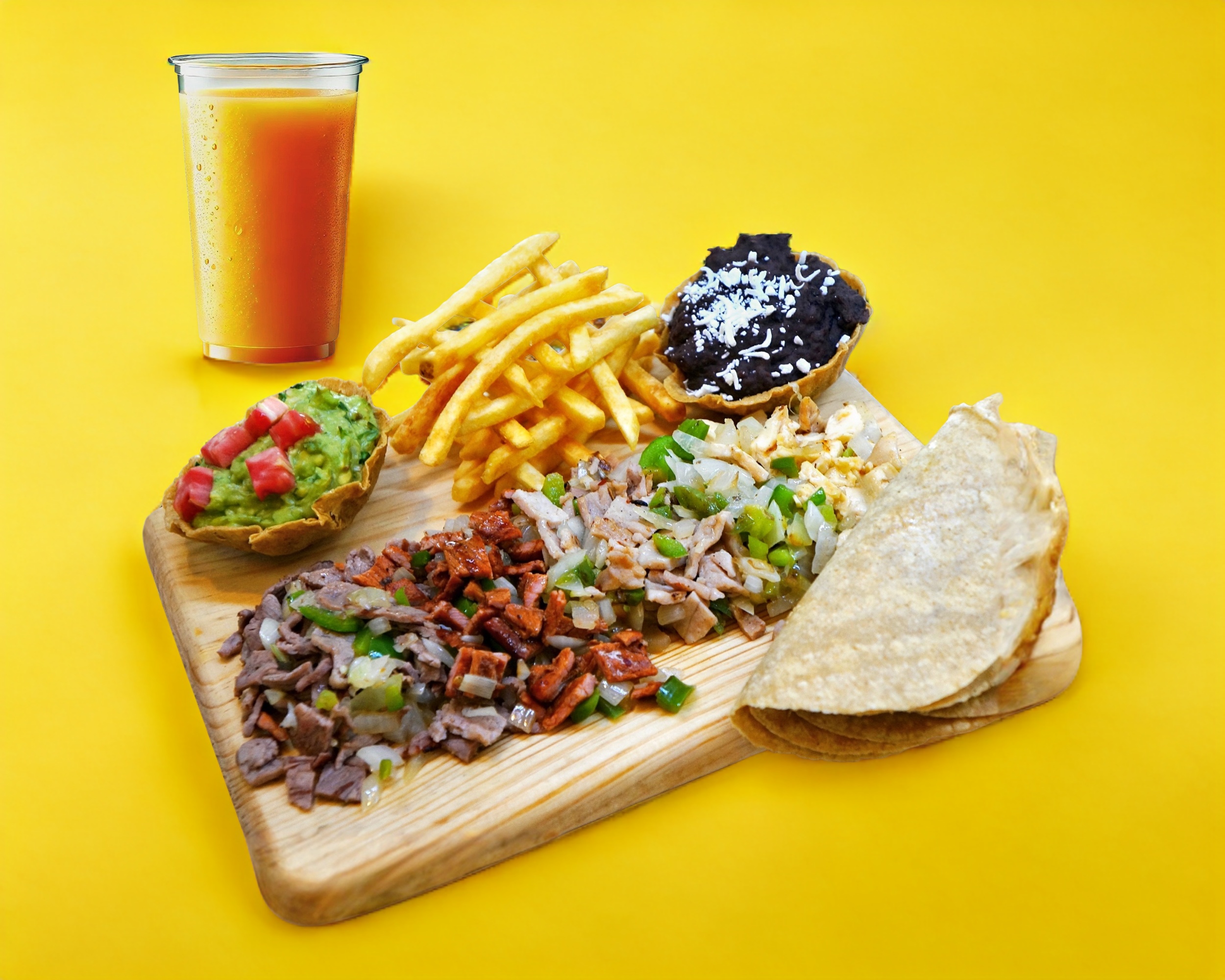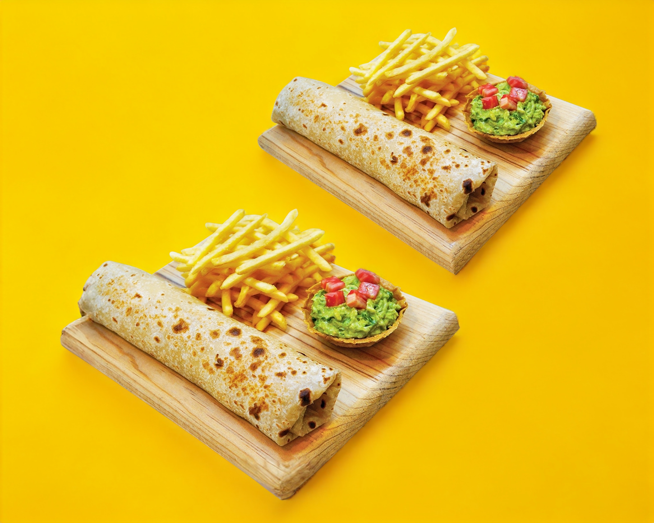 Dos burrito rellenos de arrachera, pollo, pastor, frijoles y queso. Acompañados de papas a la francesa y guacamole.