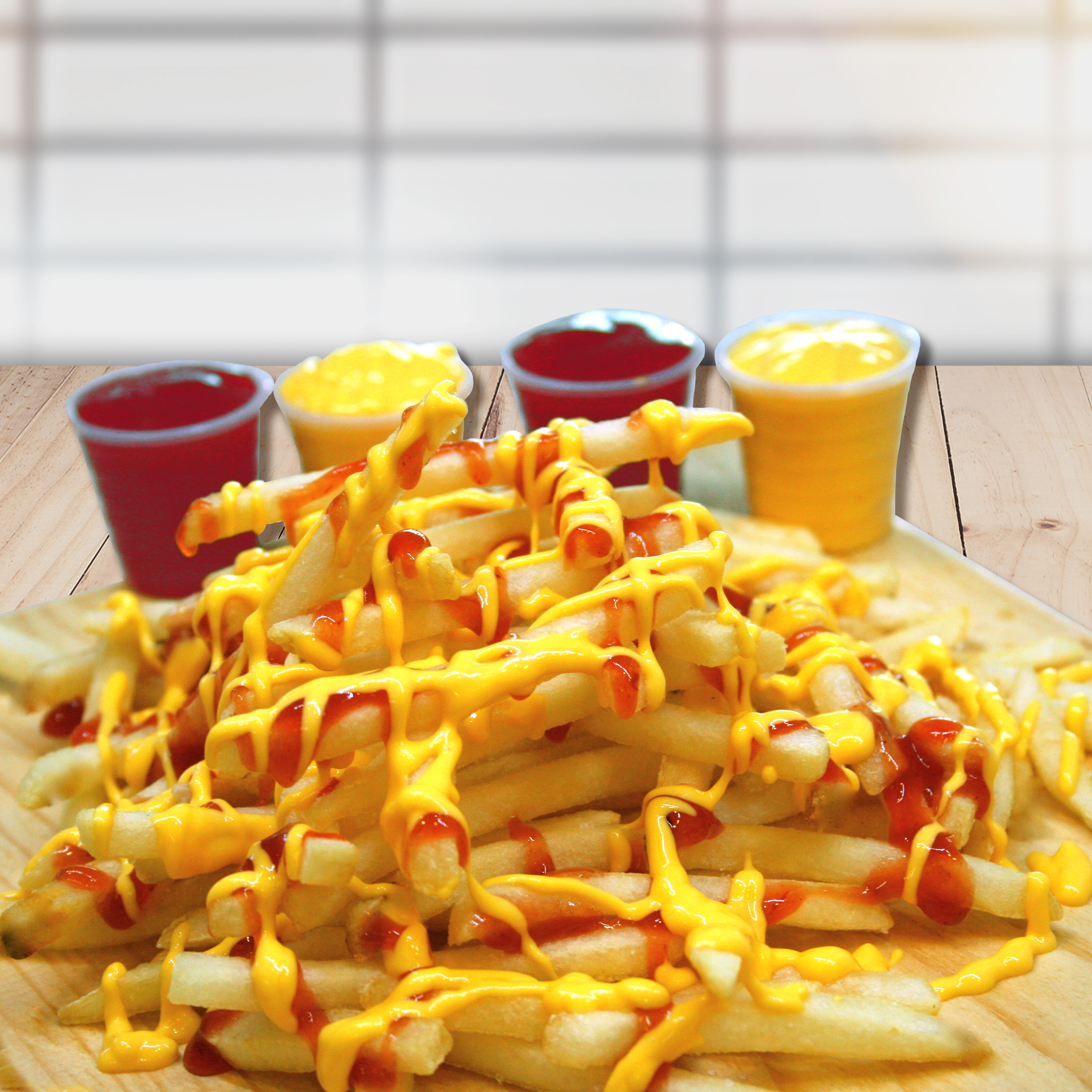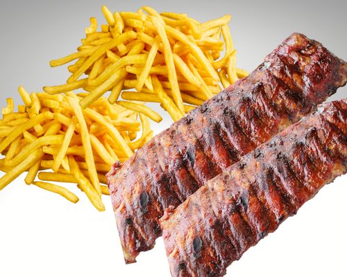 2 kilos de BBQ ribs + 1 kilo de papas a la francesa + queso cheddar para dipear.