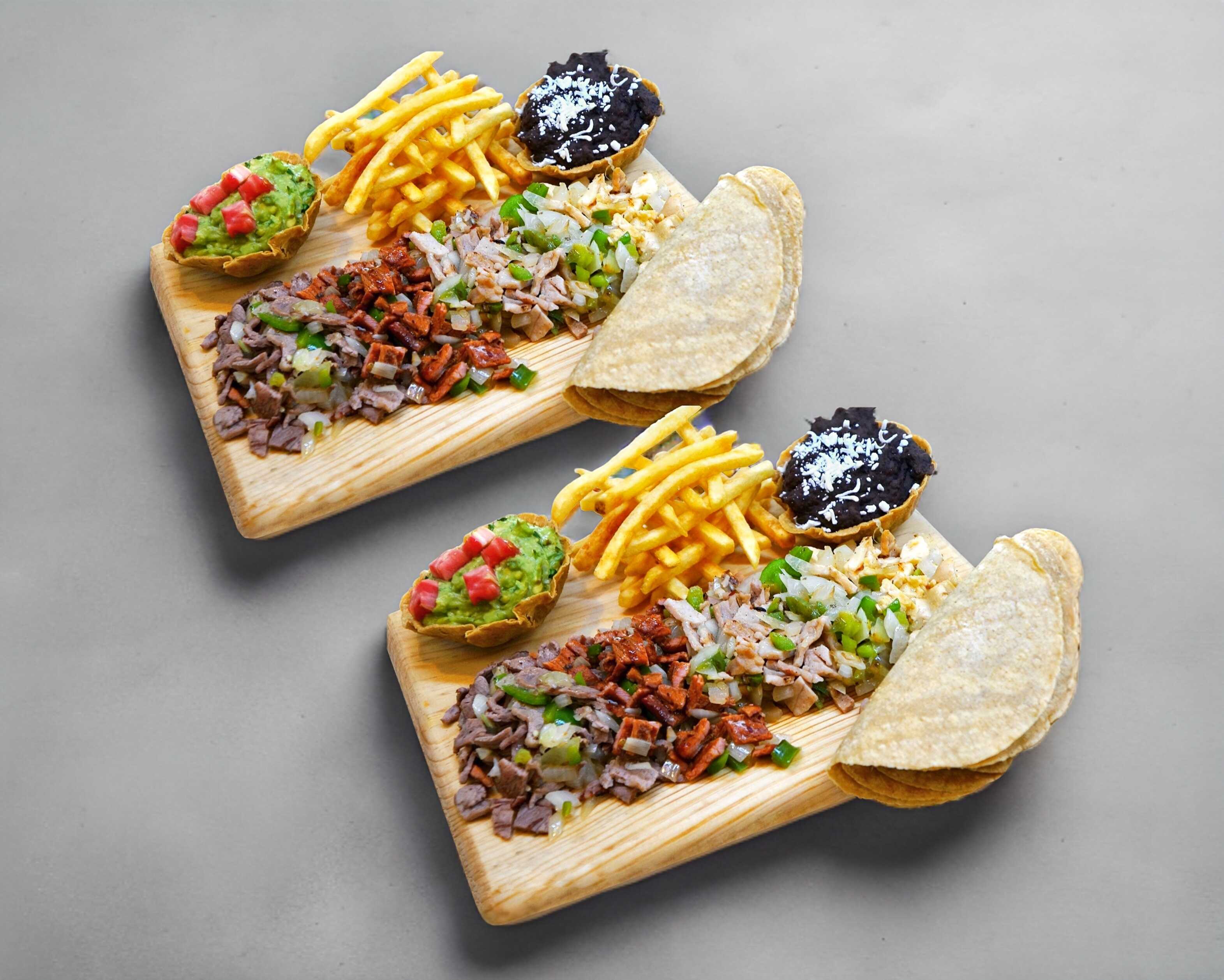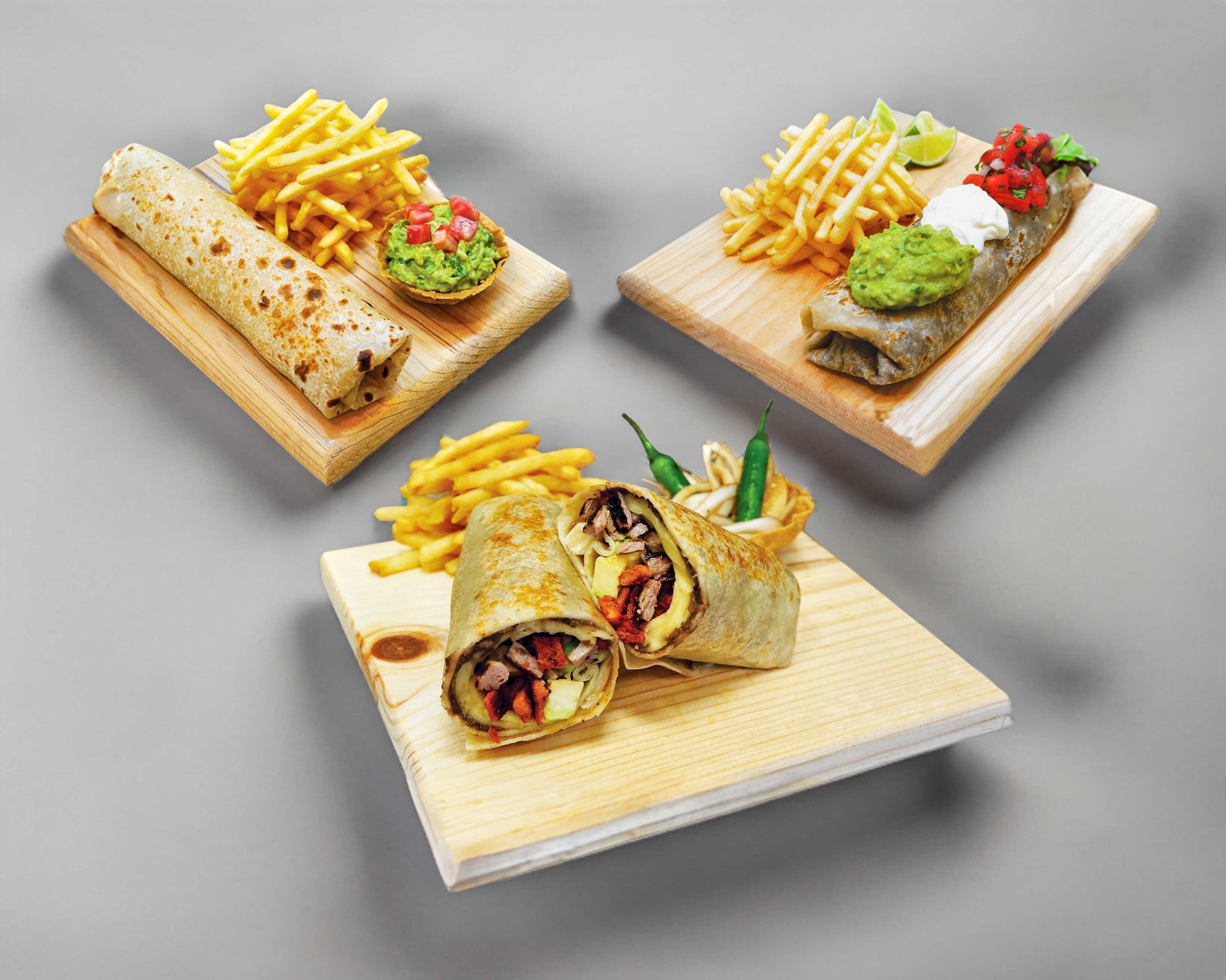 Dos burritos rellenos de arrachera, pastor, queso, frijoles y aguacate. Acompañado de papas a la francesa y chiles toreados.
