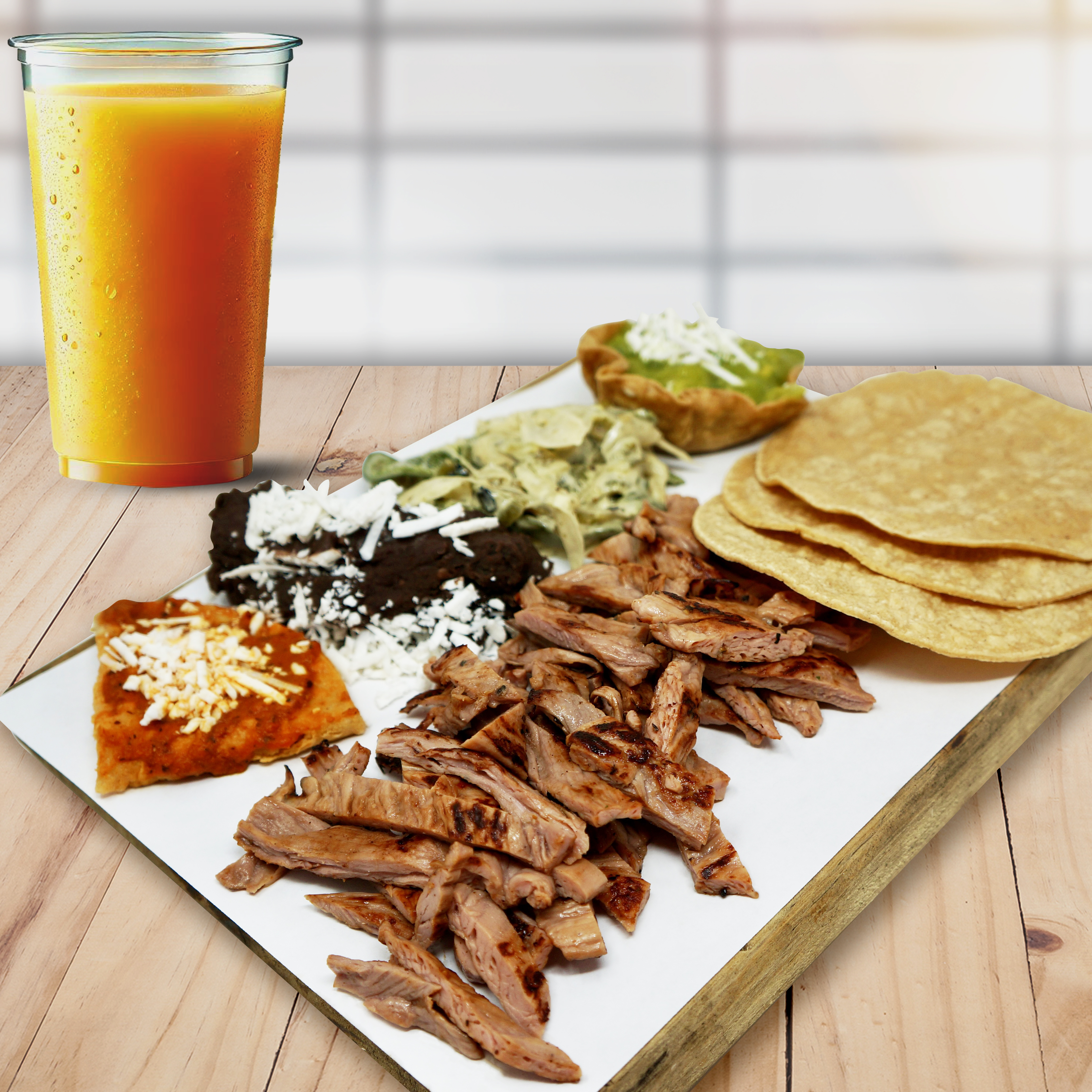 Bistec fileteado. Acompañado de rajas, guacamole, frijoles, enchilada y tortillas de maíz. Incluye agua del día.
