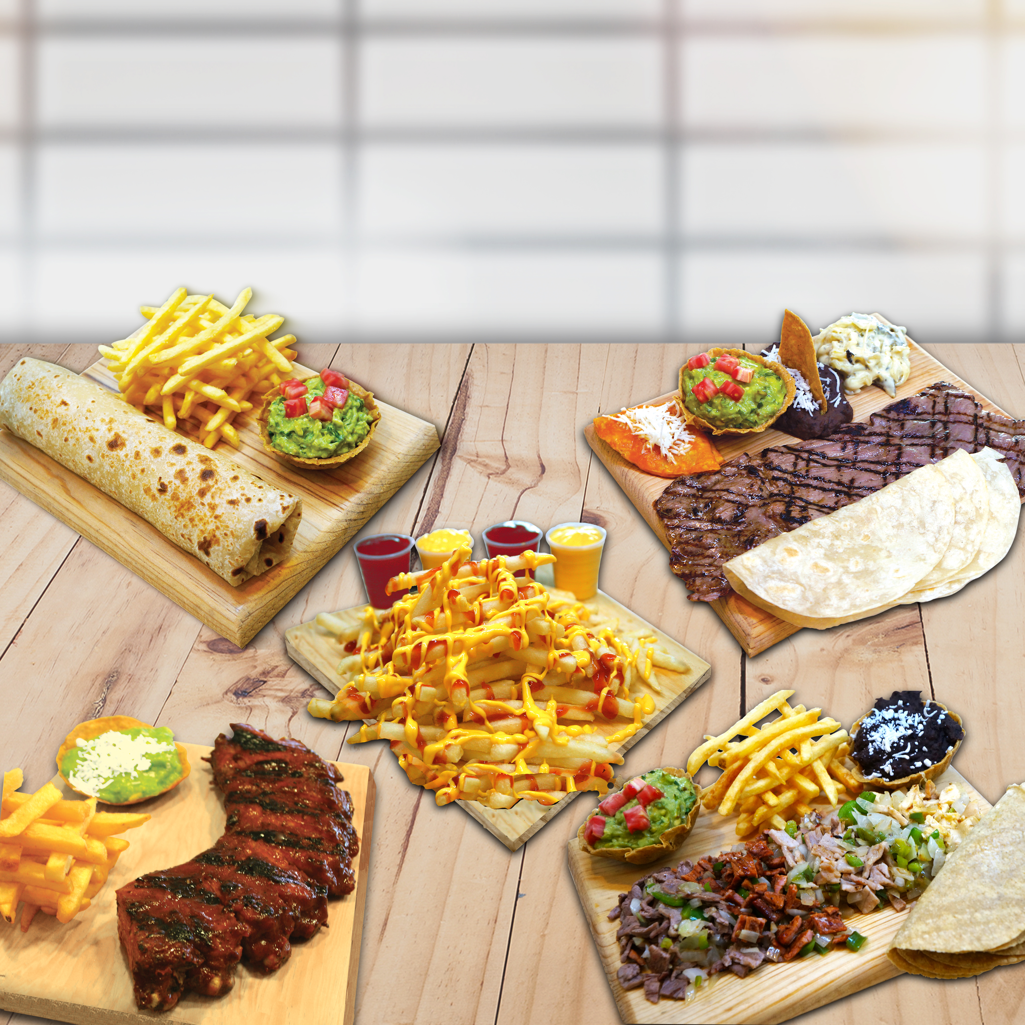 Combinación de 5 platillos (Huesitos BBQ, Arrachera Tampiqueña, Burrito X-TREME, Alambre Combinado, Papas Grill)