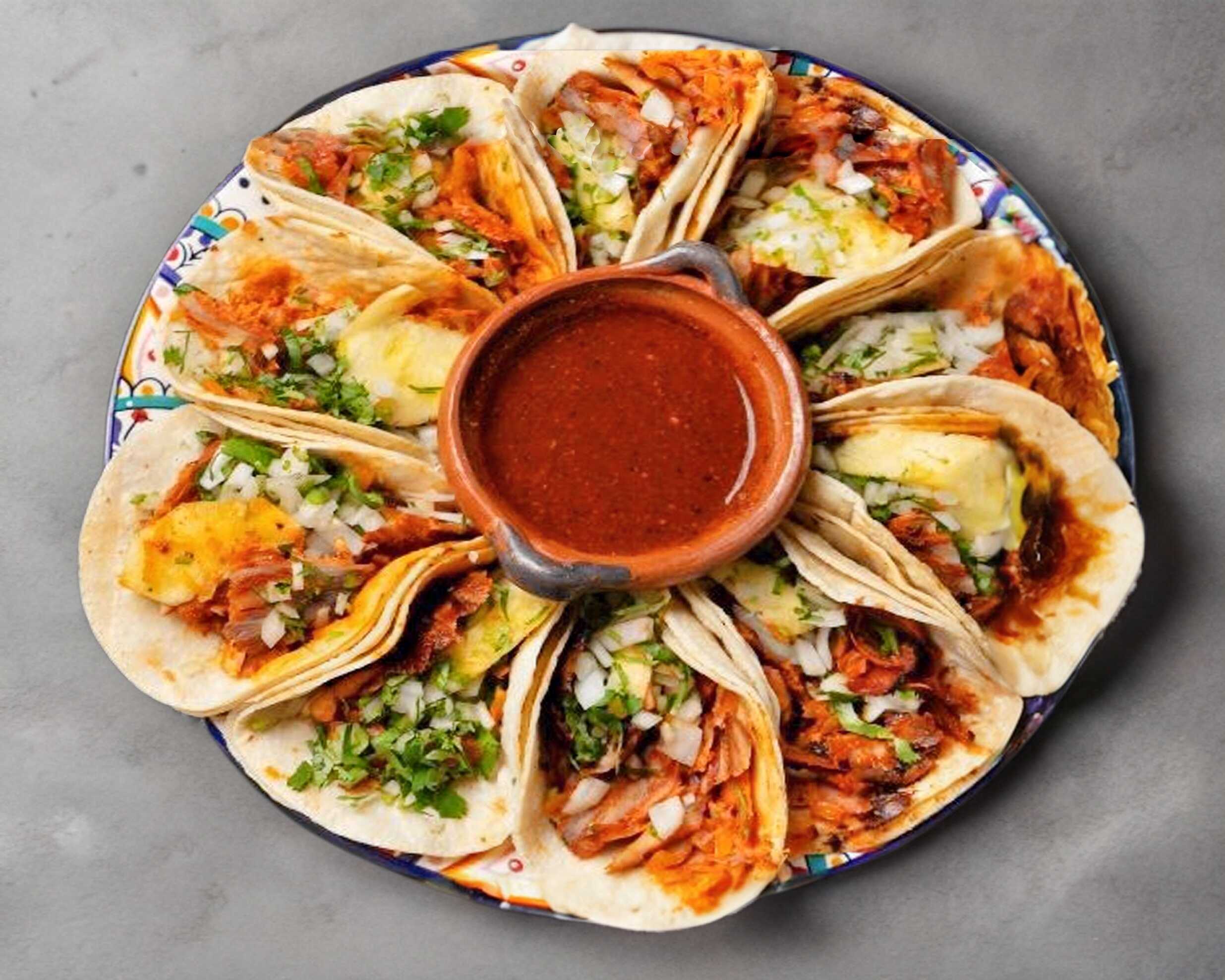 10 tacos al pastor cocinados a fuego lento en nuestro carbón.