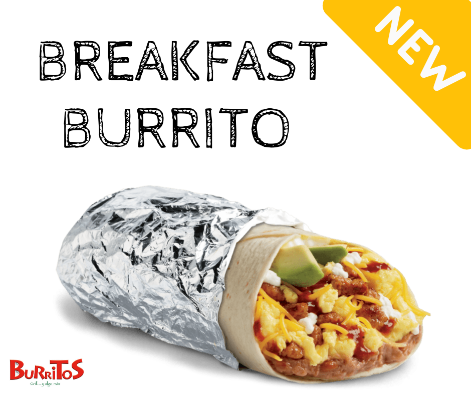 Burrito relleno de frijoles refritos, queso, huevo revuelto con chorizo, aguacate y papas a la francesa.