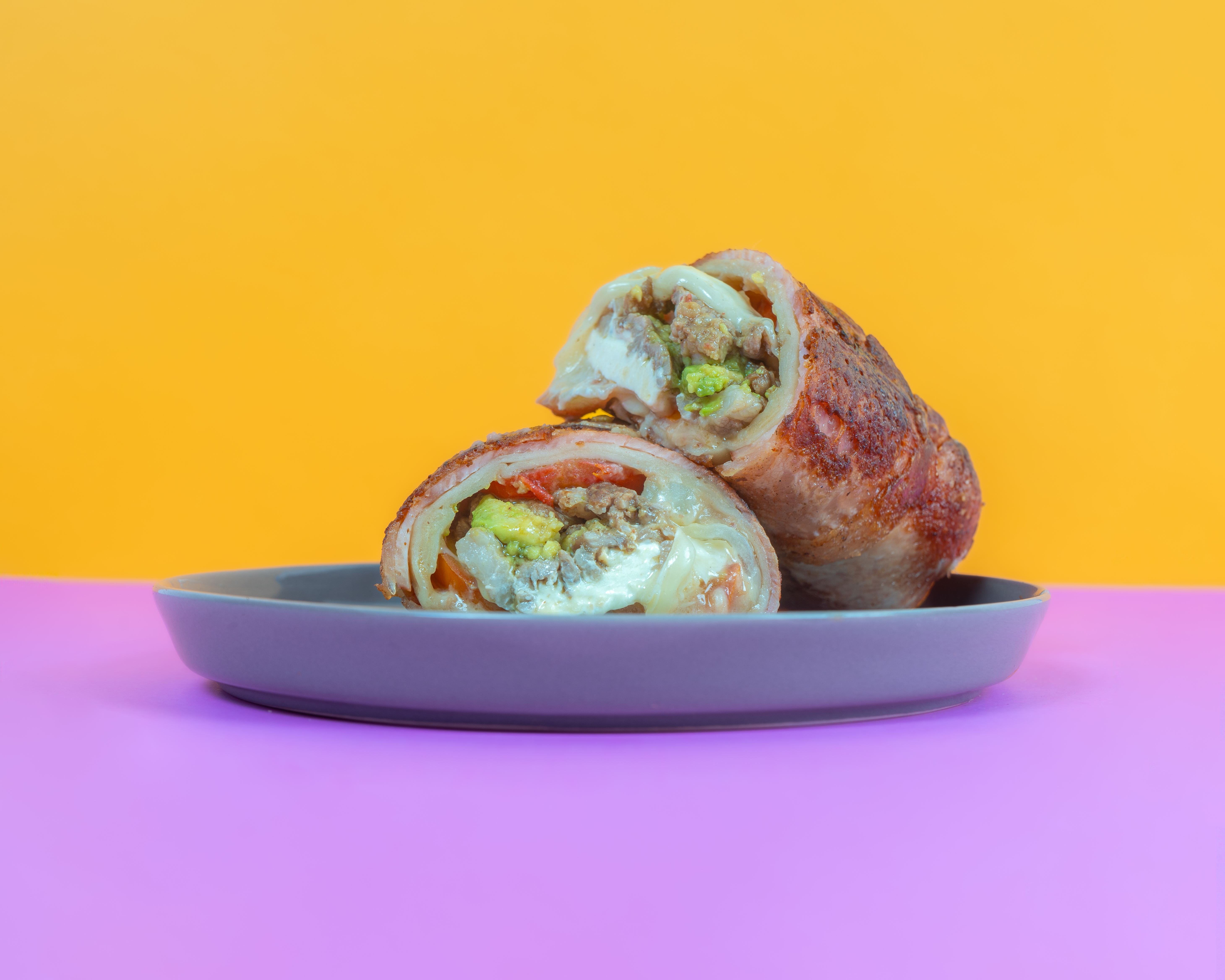 Tortilla especial, Mezcla de Quesos, queso Philadelphia, Frijoles Refritos, papas, aguacate y 100 gr de Bistec, envuelto en tocino