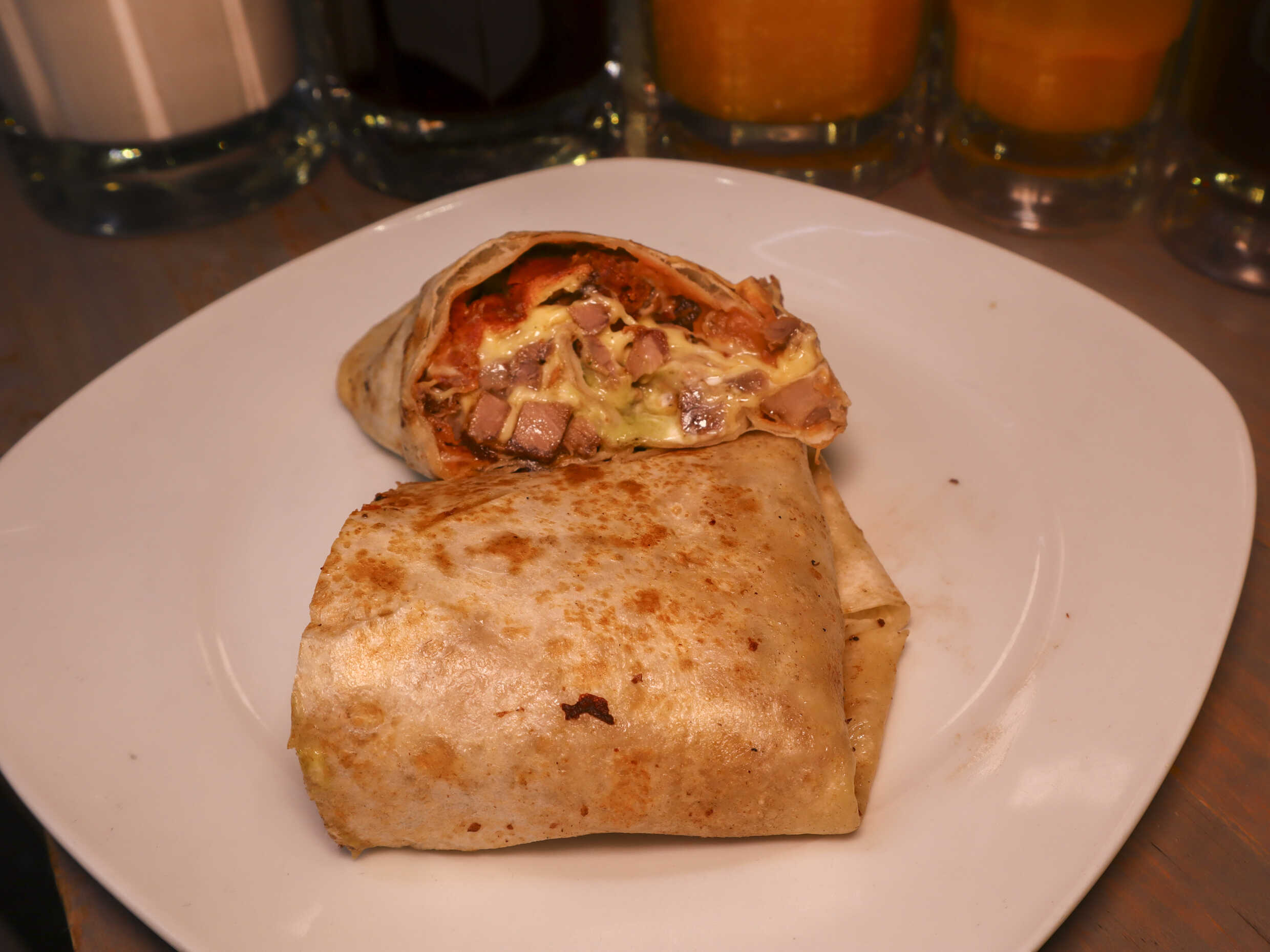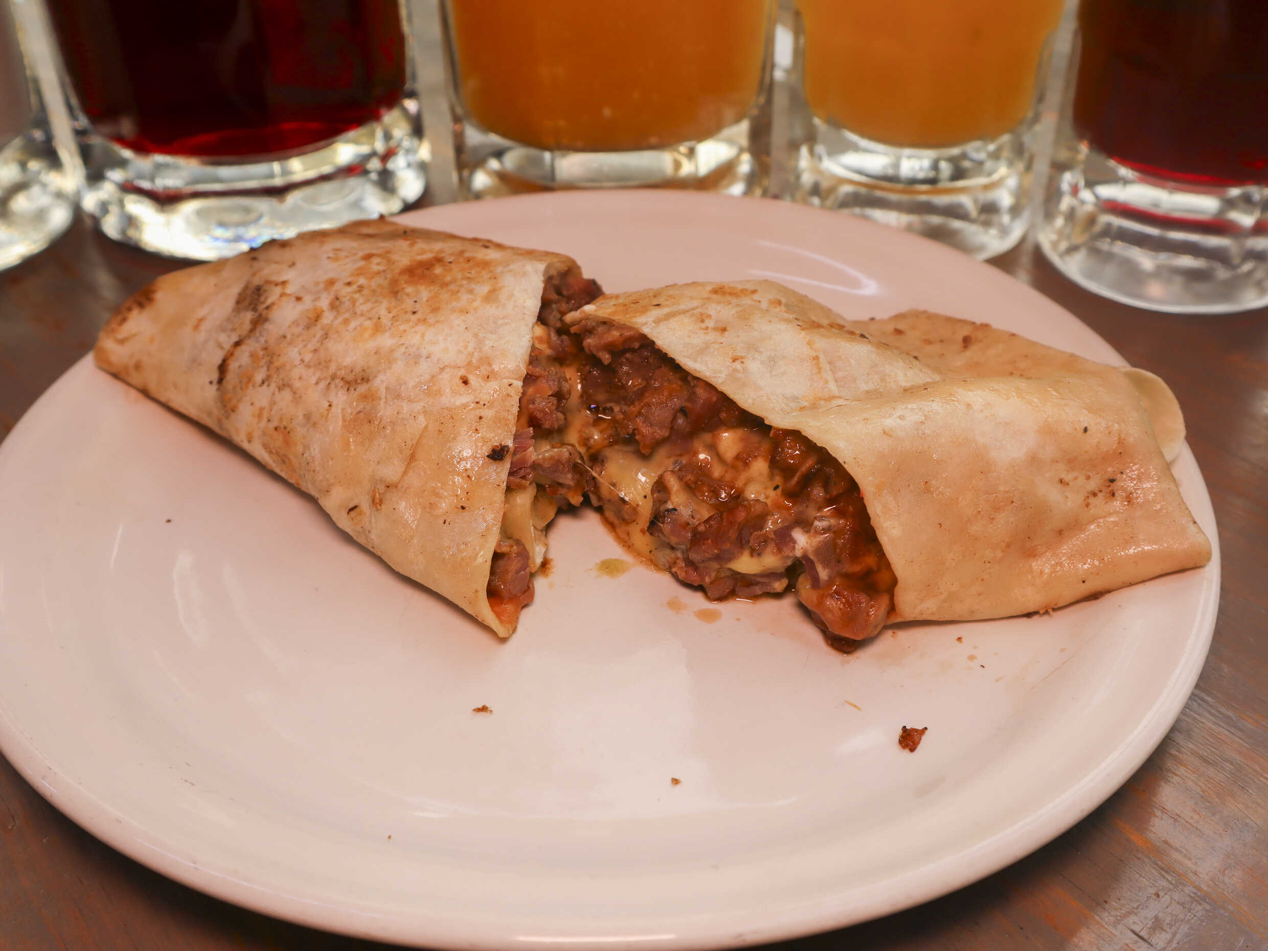Tortilla de harina, frijoles maneados, chorizo argentino, queso manchego, crema y guacamole.