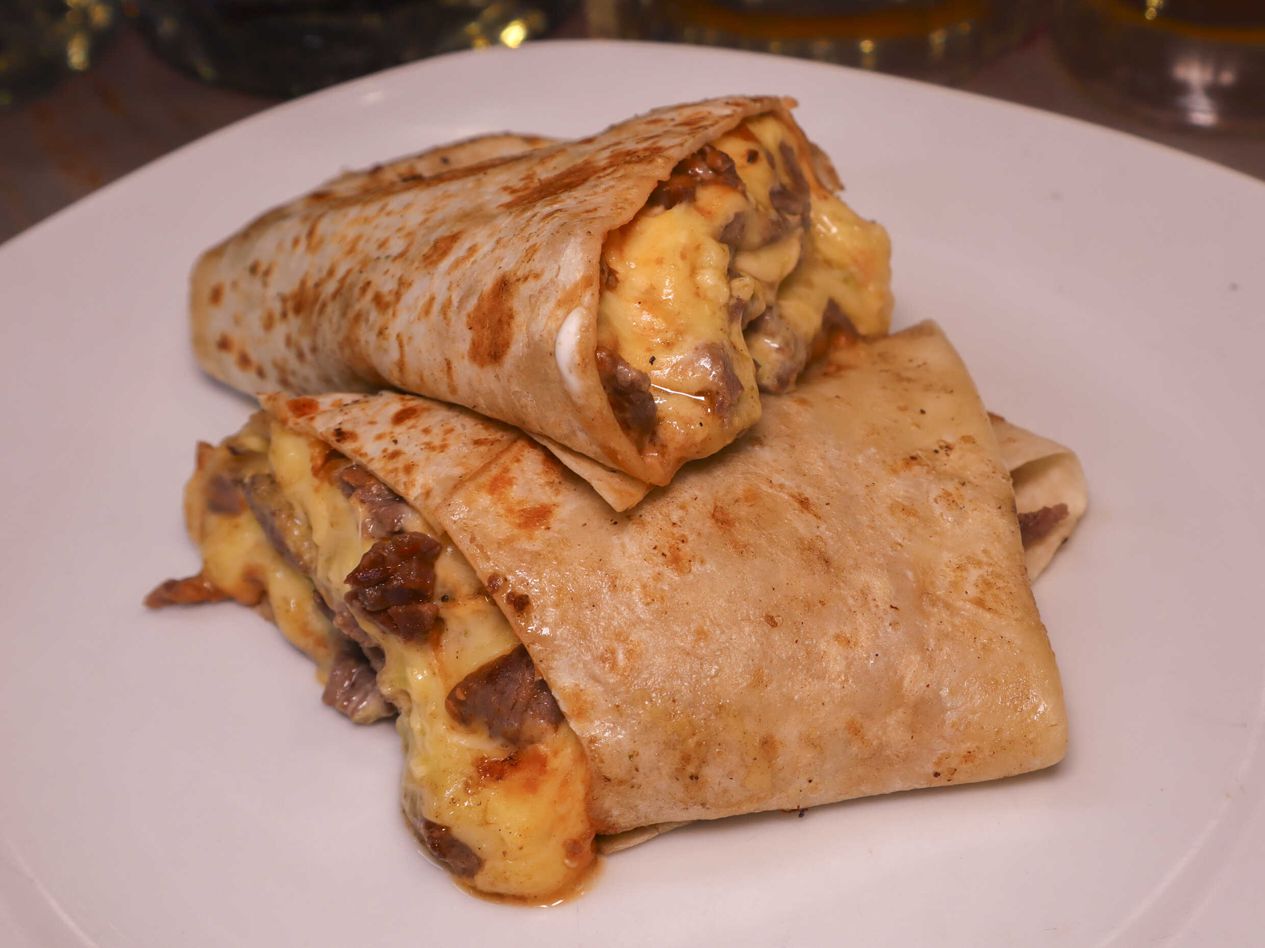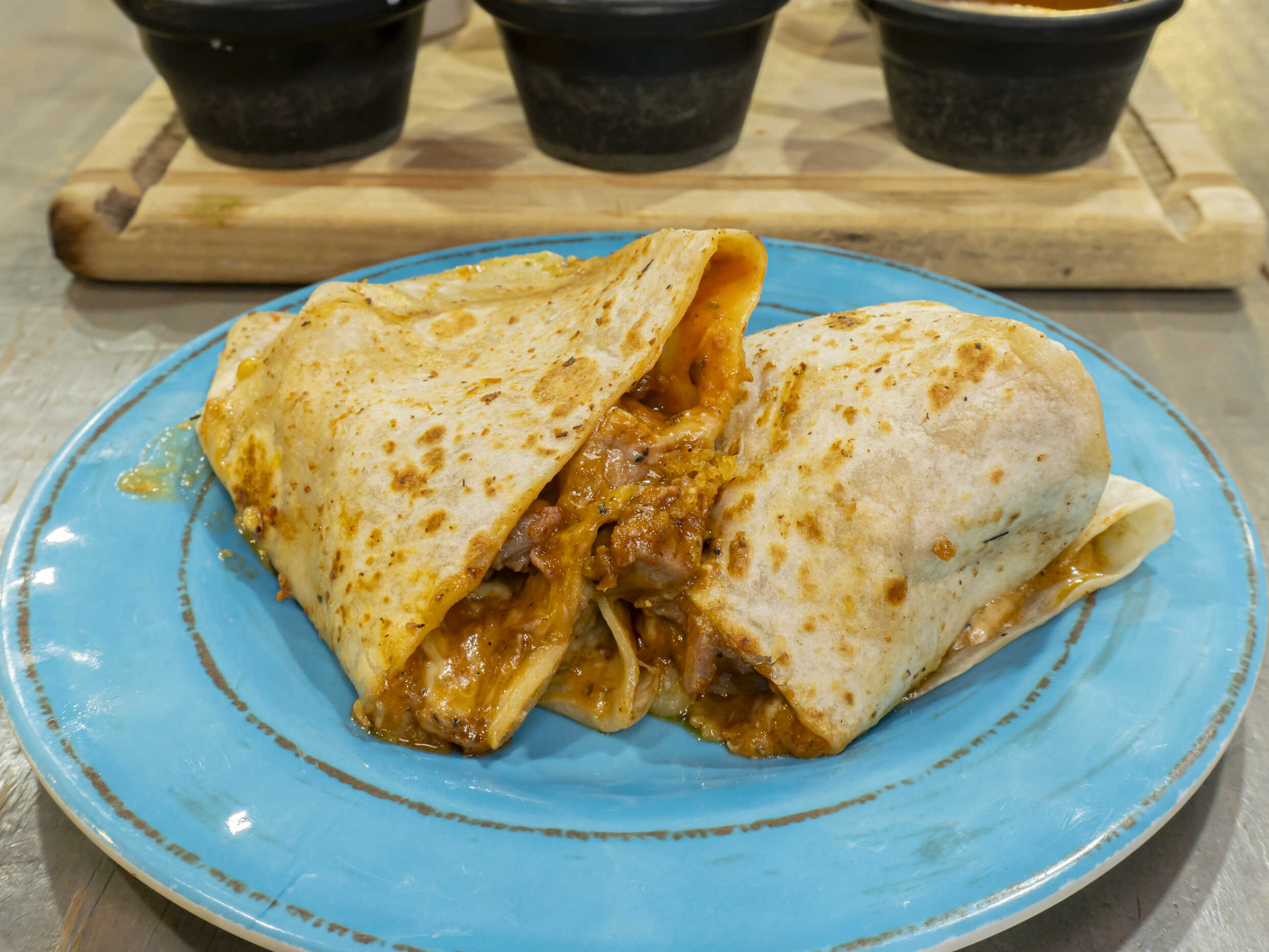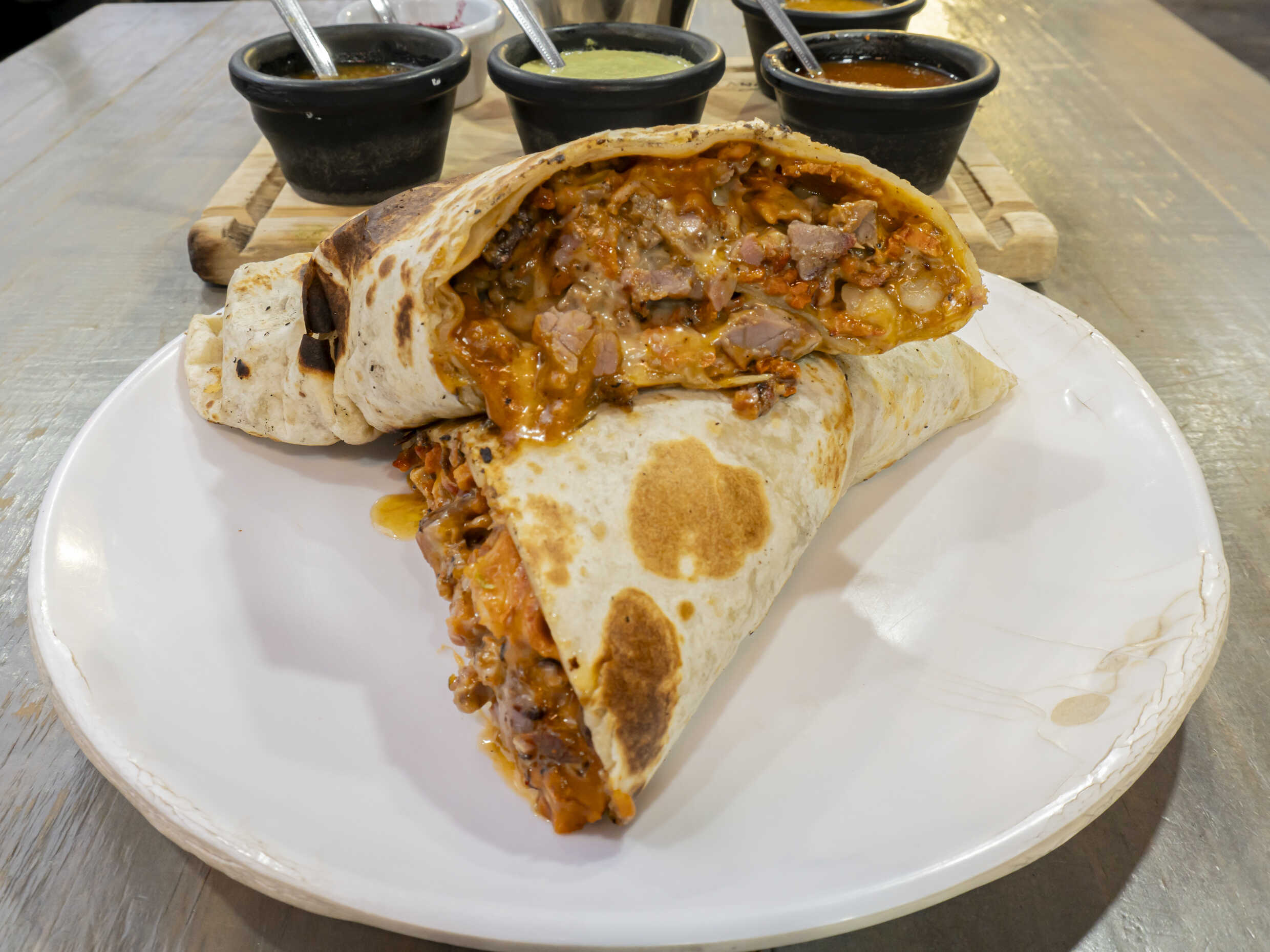Tortilla de harina, frijoles maneados, sirloin, queso manchego, crema y guacamole.