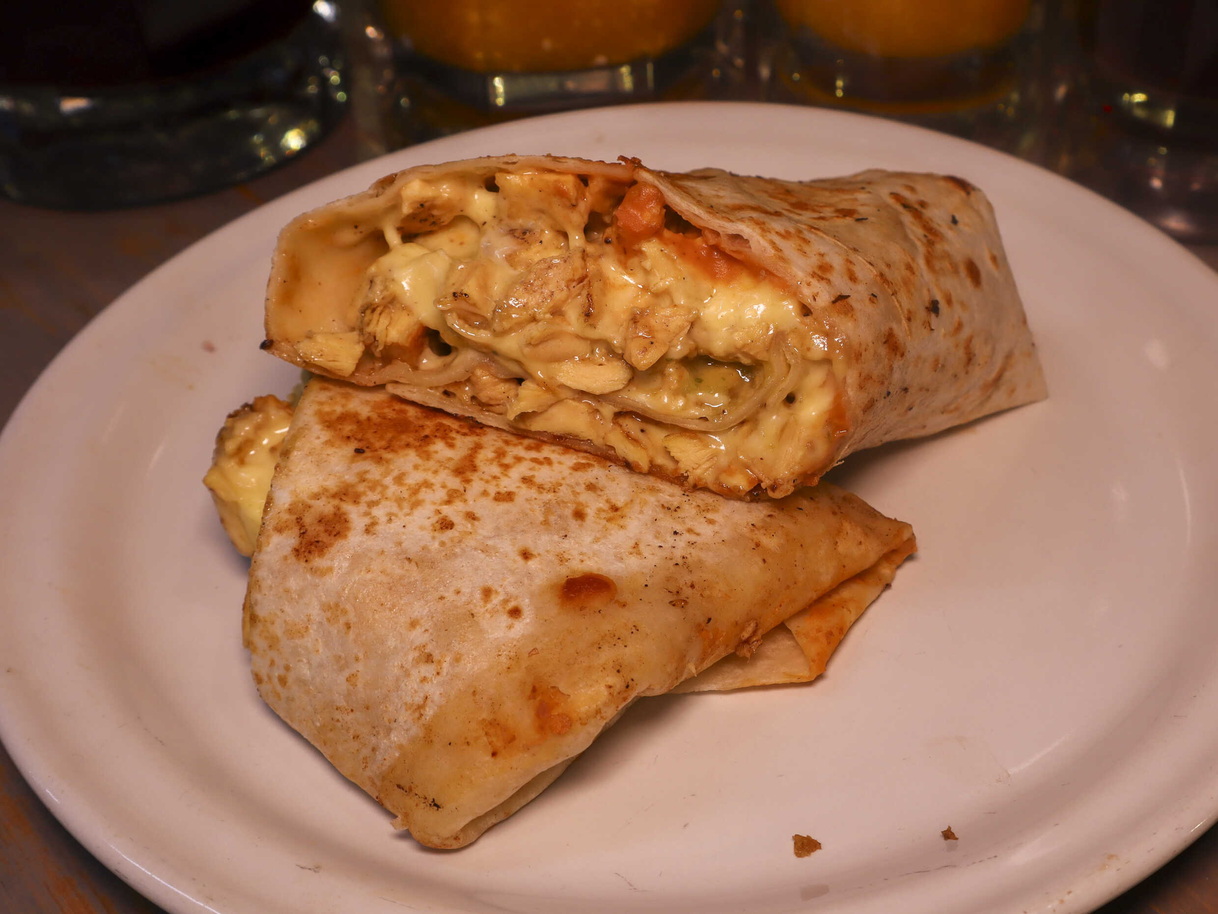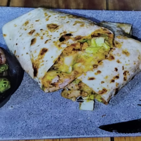 Tortilla de harina, frijoles maneados, pollo, queso manchego, crema y guacamole.