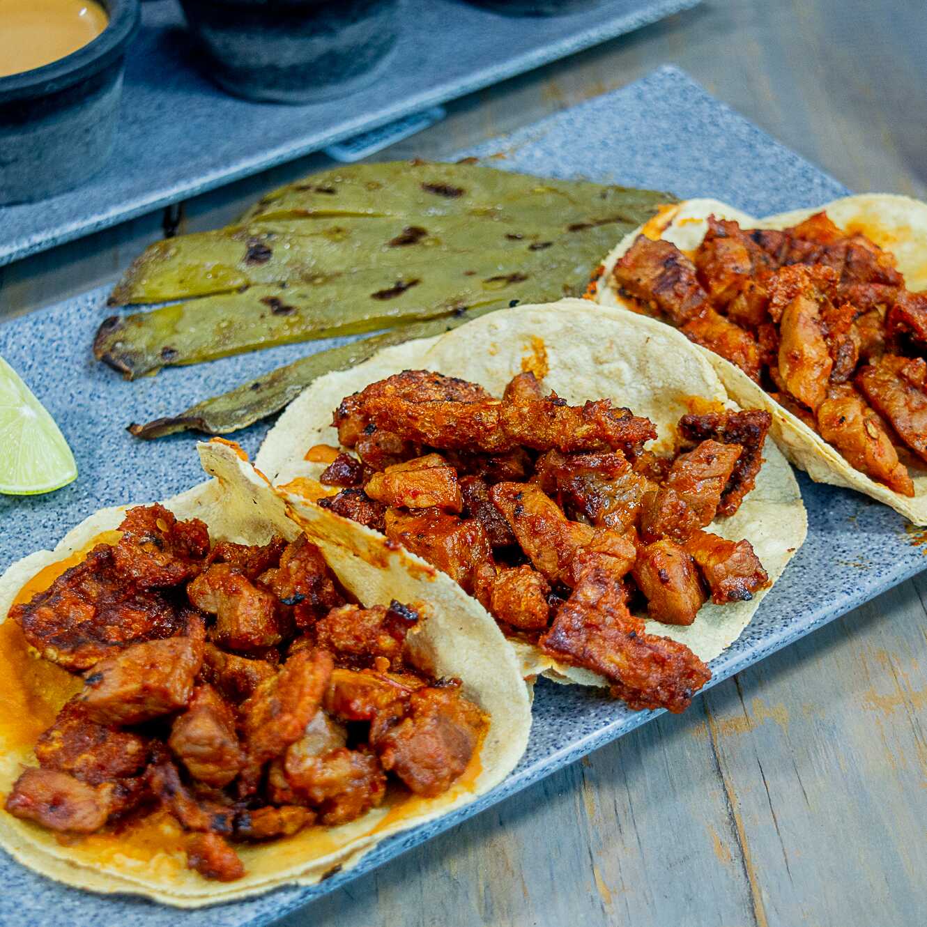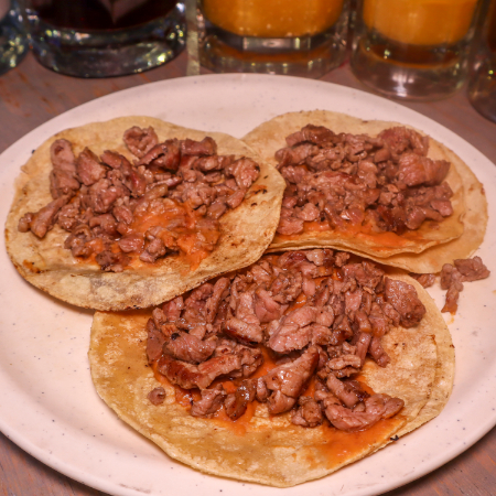 3 tacos de top sirloin, chicharron y salsa de la casa en tortilla de maíz y frijoles maneados