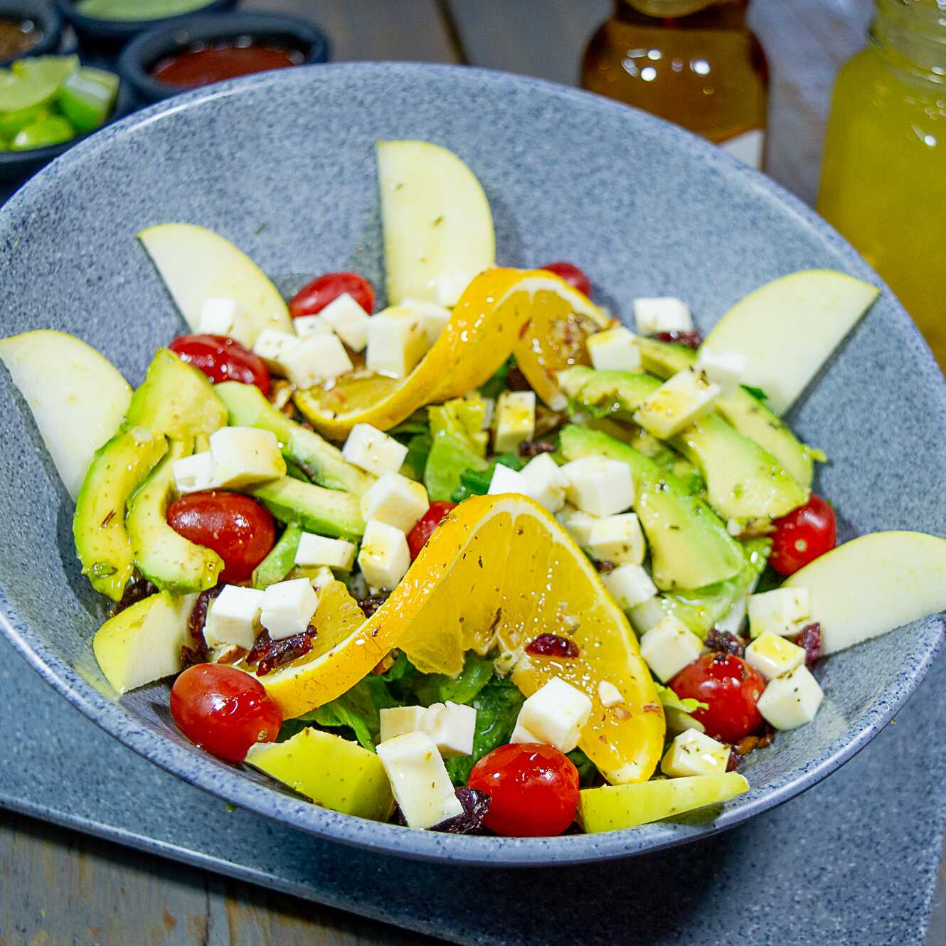Lechuga, jitomate cherry, aguacate, manzana, naranja, nuez, arandano, queso panela y aderezo miel