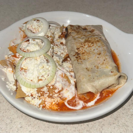 Burrito mediano, con chilaquiles (proteina a elegir)
