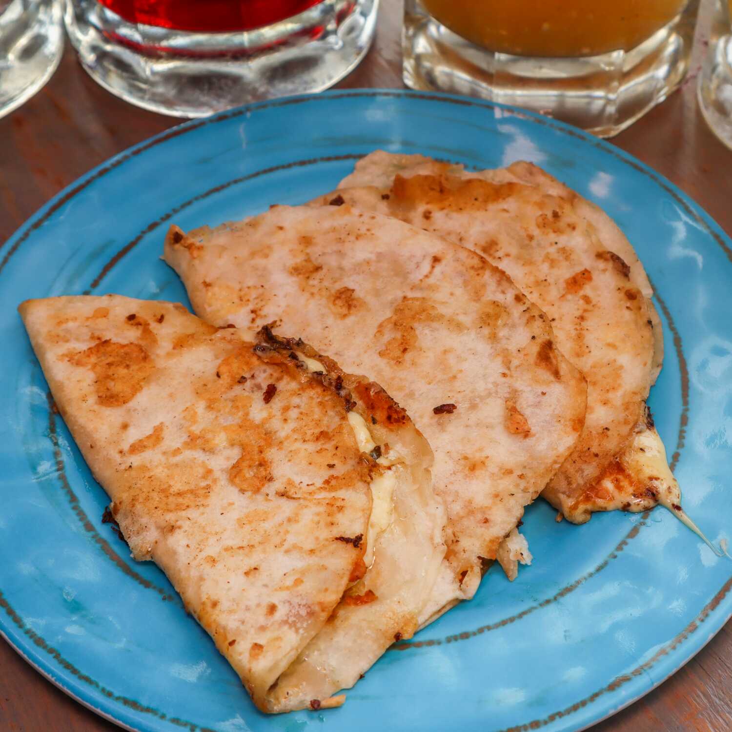 3 quesadillas en tortilla de harina con frijoles maneados, queso manchego y elotes o champiñones
