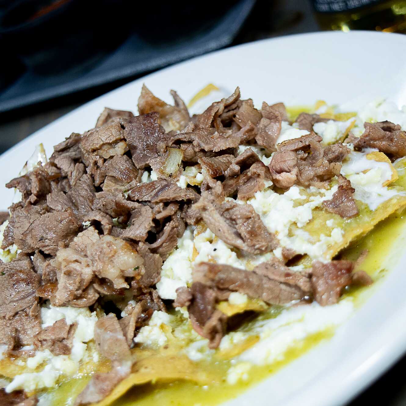 Tortilla de harina, frijoles maneados, sirloin, chicharron, salsa de la casa, queso manchego, crema y guacamole.