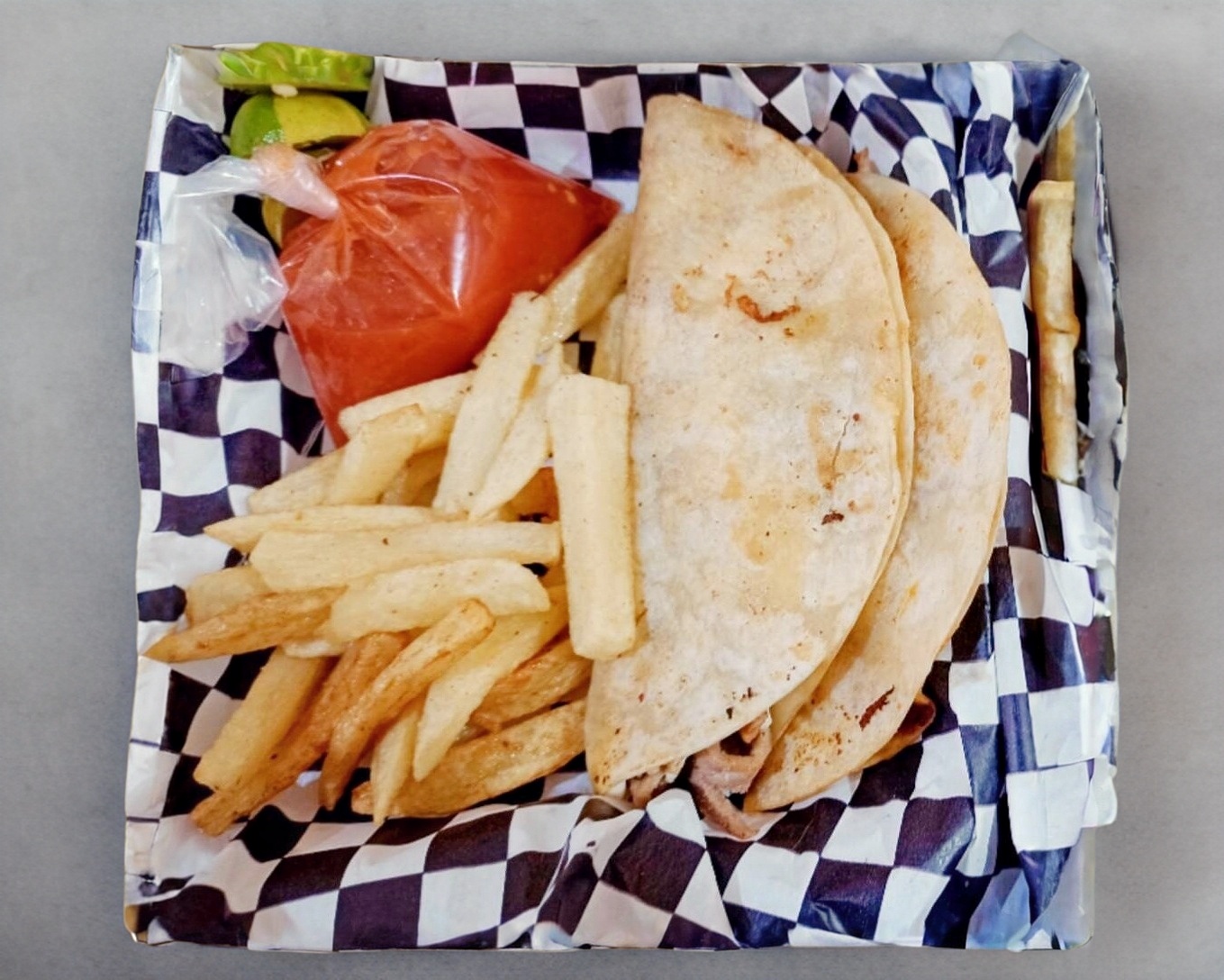 Orden de 2 quesocarne peso cada una 130 gramos tortilla de harina pastor queso Oaxaca acompañado de limones papas a la francesa salsa y piña