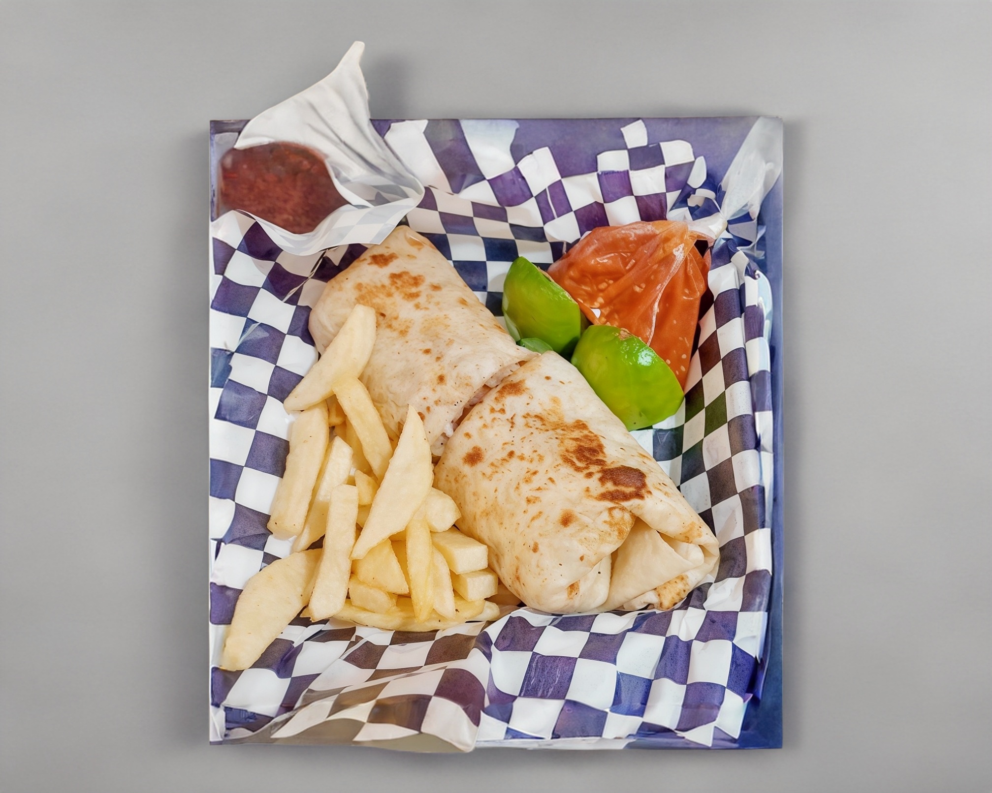 Tortilla burrera frijoles refritos lechuga Oaxaca pastor peso 300 g acompañado de papas a la francesa salsa limones