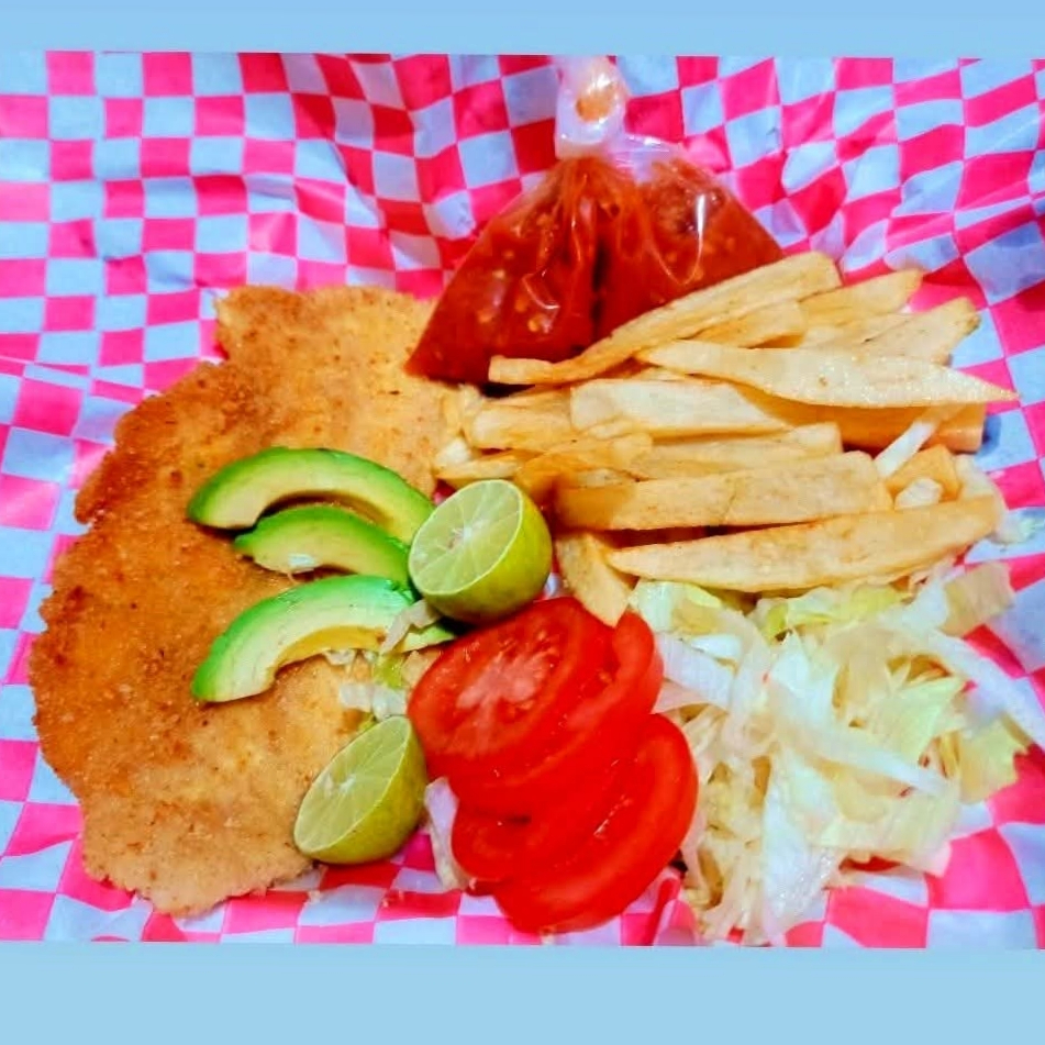 Tortilla burrera frijoles refritos lechuga Oaxaca Milanesa peso 300 g acompañado de papas a la francesa salsa limones