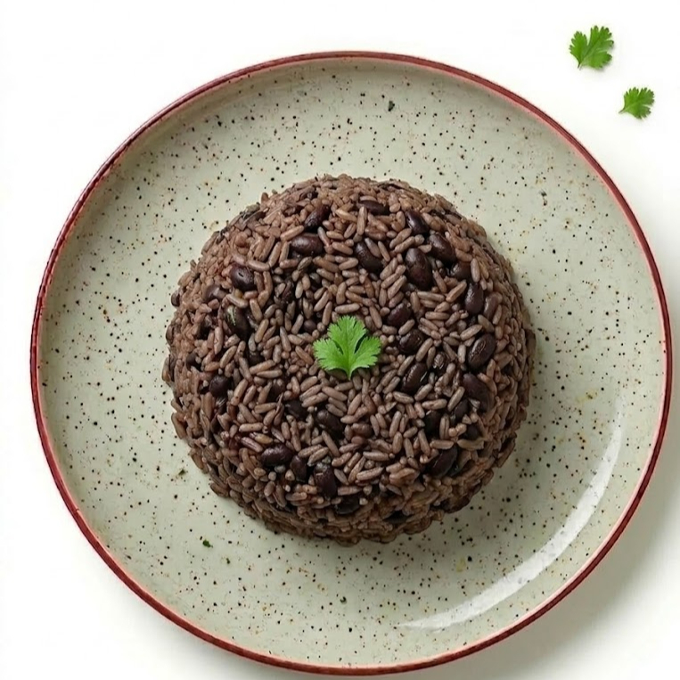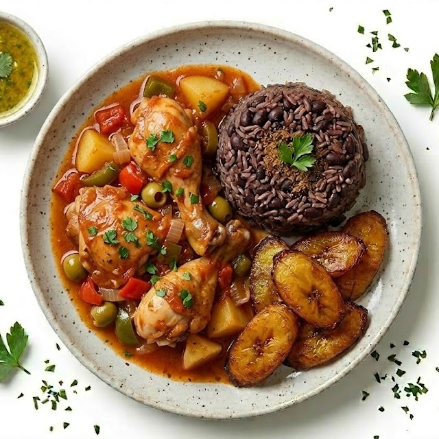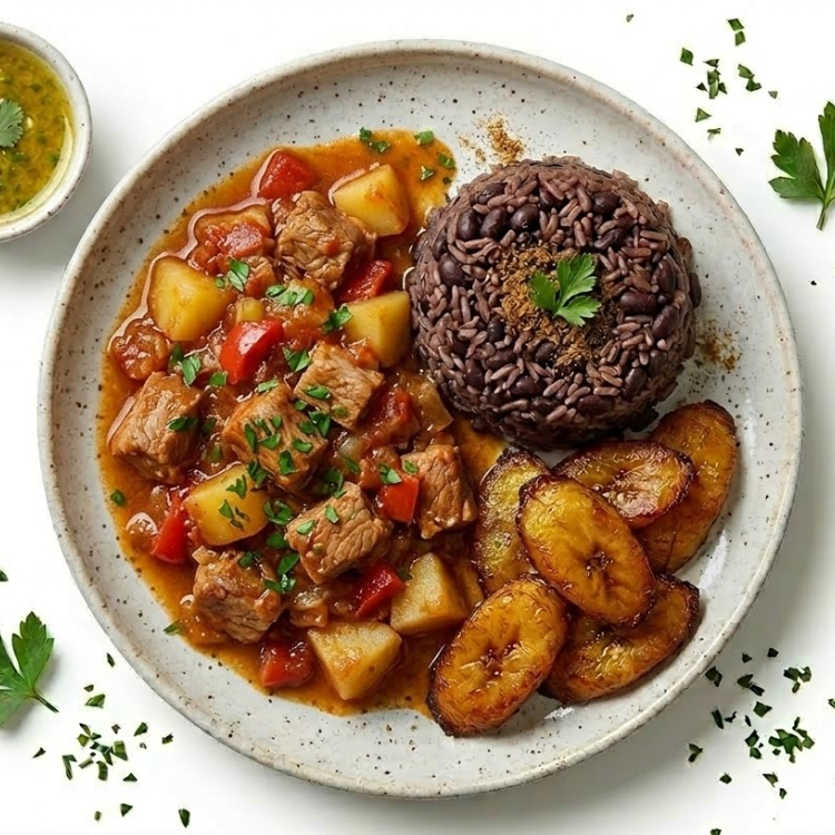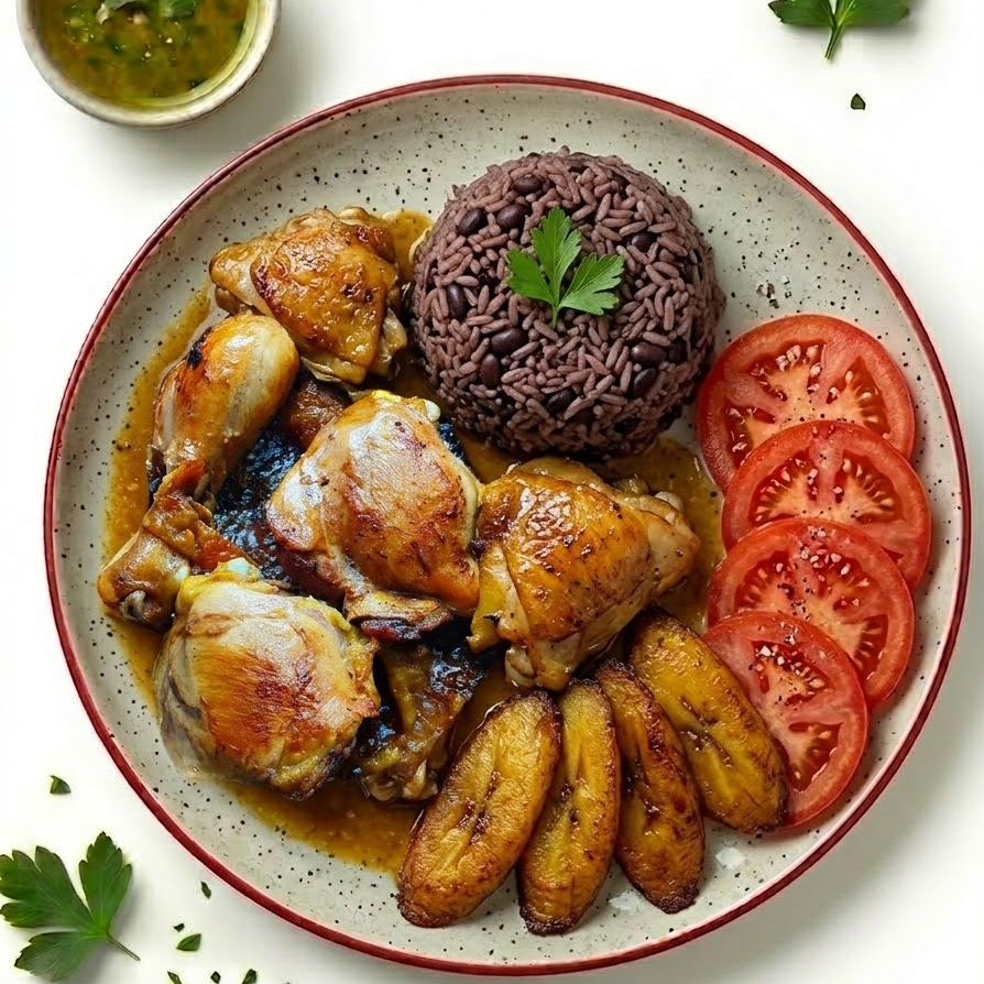Pollo tierno cocinado en una salsa llena de sabor al estilo cubano, con ese toque casero que siempre reconforta. Servido con moros y cristianos, vegetales y plátanos maduros fritos para un plato completo y bien equilibrado.
