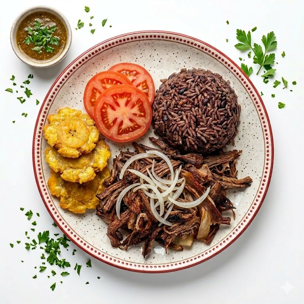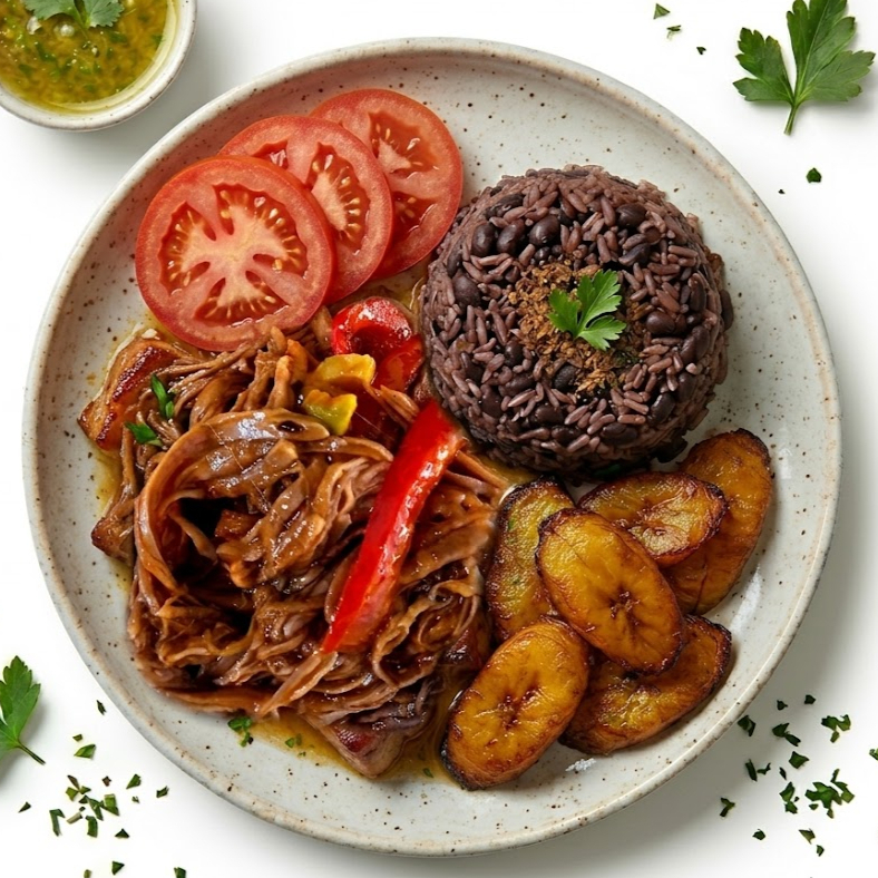 Carne deshebrada cocinada a fuego lento en una salsa llena de sabor al estilo cubano. Se acompaña con moros y cristianos, vegetales y plátanos maduros fritos que equilibran perfectamente cada bocado. Un clásico completo que siempre satisface.