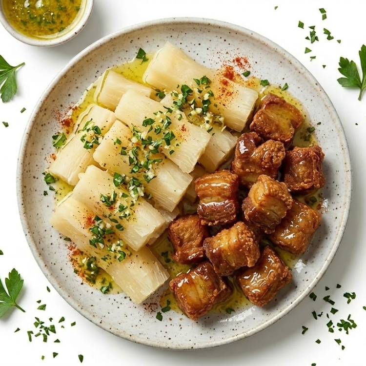 Yuca suave acompañada de masa de cerdo dorada y crujiente, sazonada al estilo cubano. Una combinación clásica, llena de sabor y perfecta para compartir o empezar con algo fuerte.