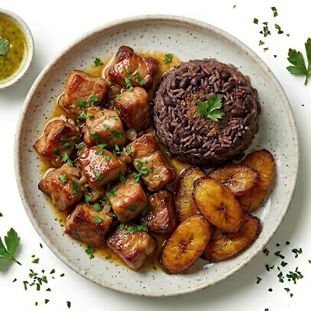 Trozos de cerdo dorados al punto perfecto, crujientes por fuera y jugosos por dentro, sazonados al estilo cubano. Servidas con moros y cristianos, vegetales y plátanos maduros fritos para un plato completo y lleno de sabor.