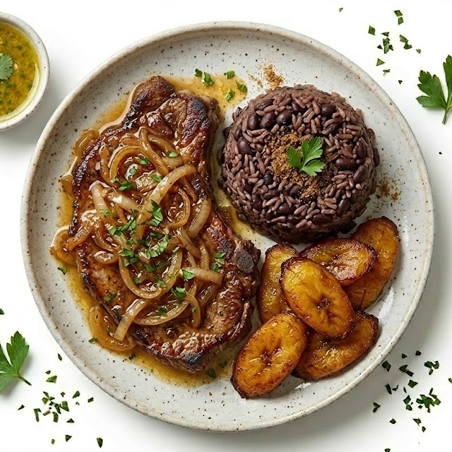 Bistec de res jugoso, cocinado al punto y cubierto con abundante cebolla salteada al estilo cubano. Servido con moros y cristianos, vegetales y plátanos maduros fritos para un plato completo, clásico y lleno de sabor.