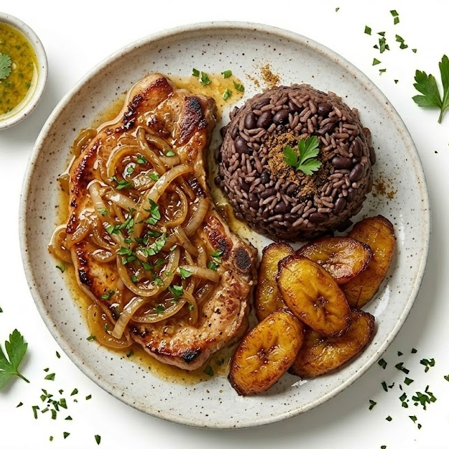 Bistec de cerdo jugoso y bien sazonado, cocinado al punto y cubierto con abundante cebolla salteada al estilo cubano. Servido con moros y cristianos, vegetales y plátanos maduros fritos para un plato completo y lleno de sabor.