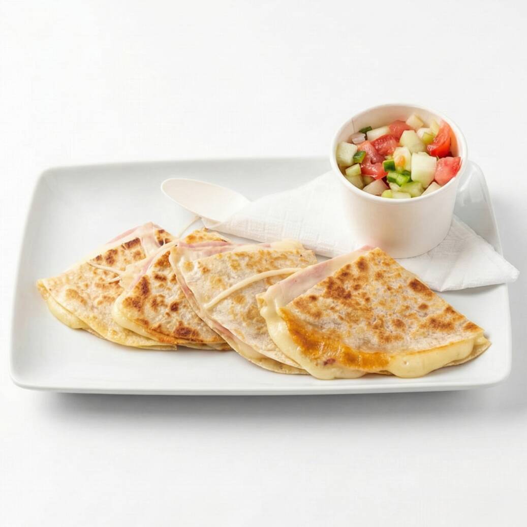 Tres tortillas de harina con jamón y queso, pico de gallo aparte.