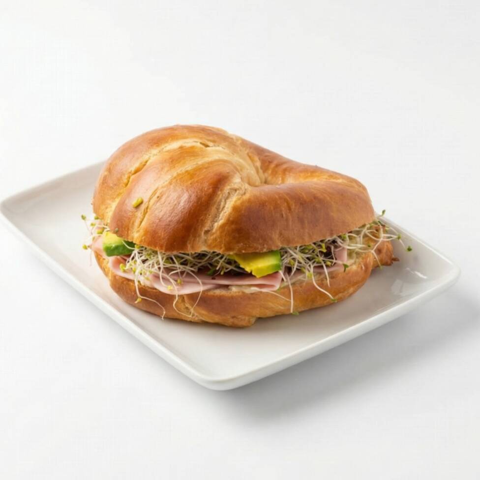 Croissant relleno de jamón y queso con aguacate y verduras.
