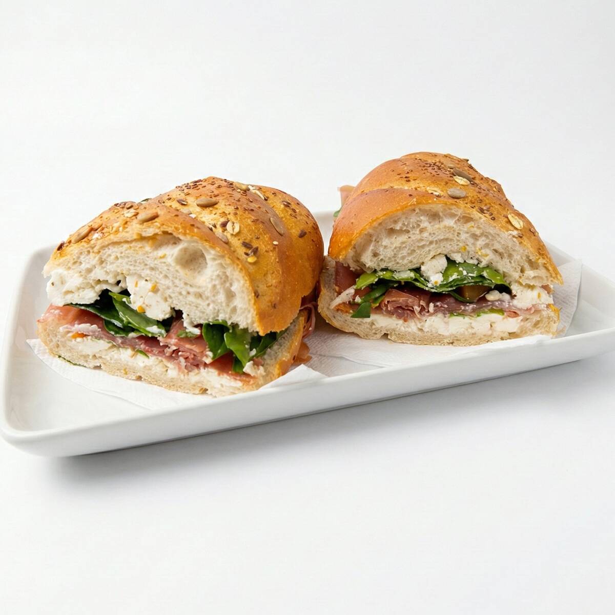 Baguette de jamón serrano con queso de cabra, espinaca y durazno