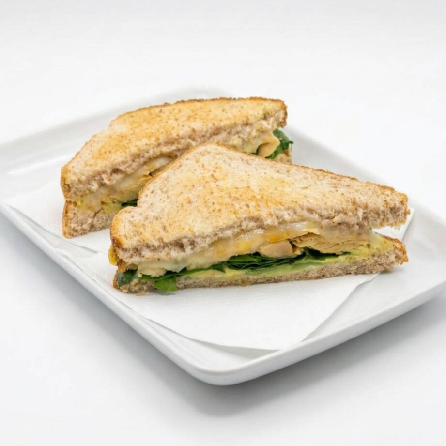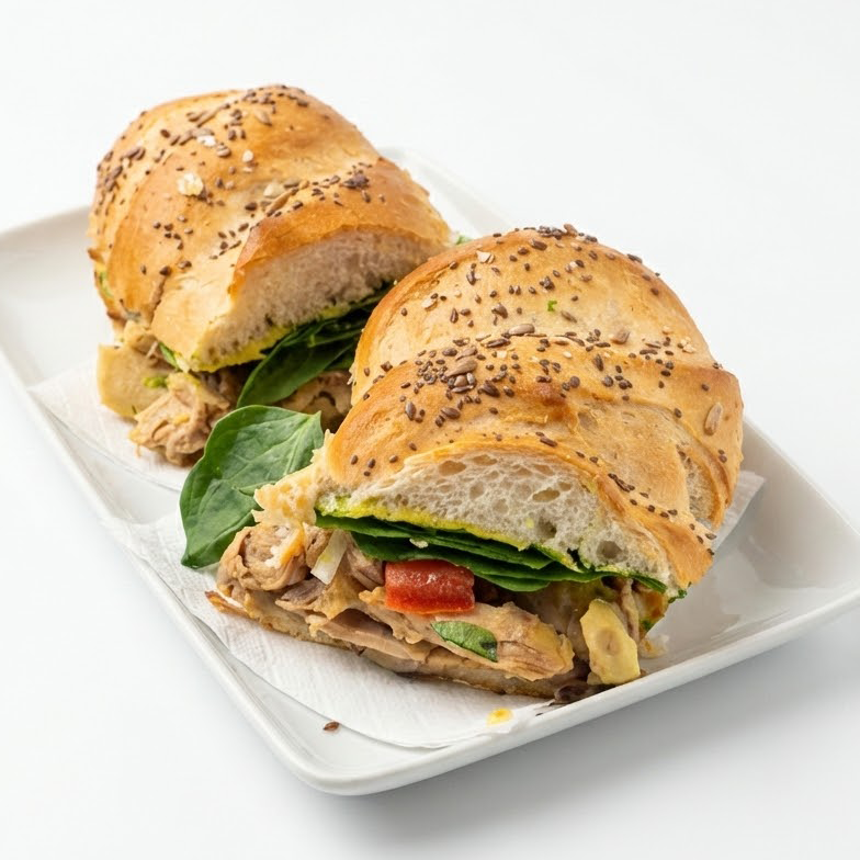 Sándwich de pollo, jamón o pechuga de pavo, queso, espinaca y aguacate.