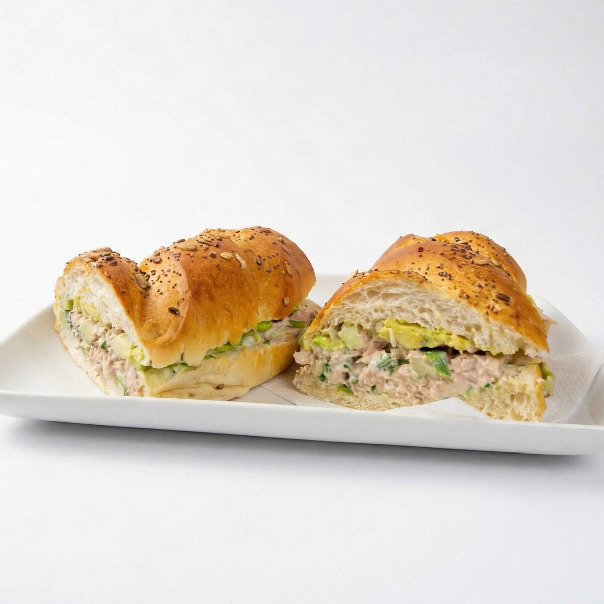 Baguette de atún, mayonesa, aguacate y verduras.