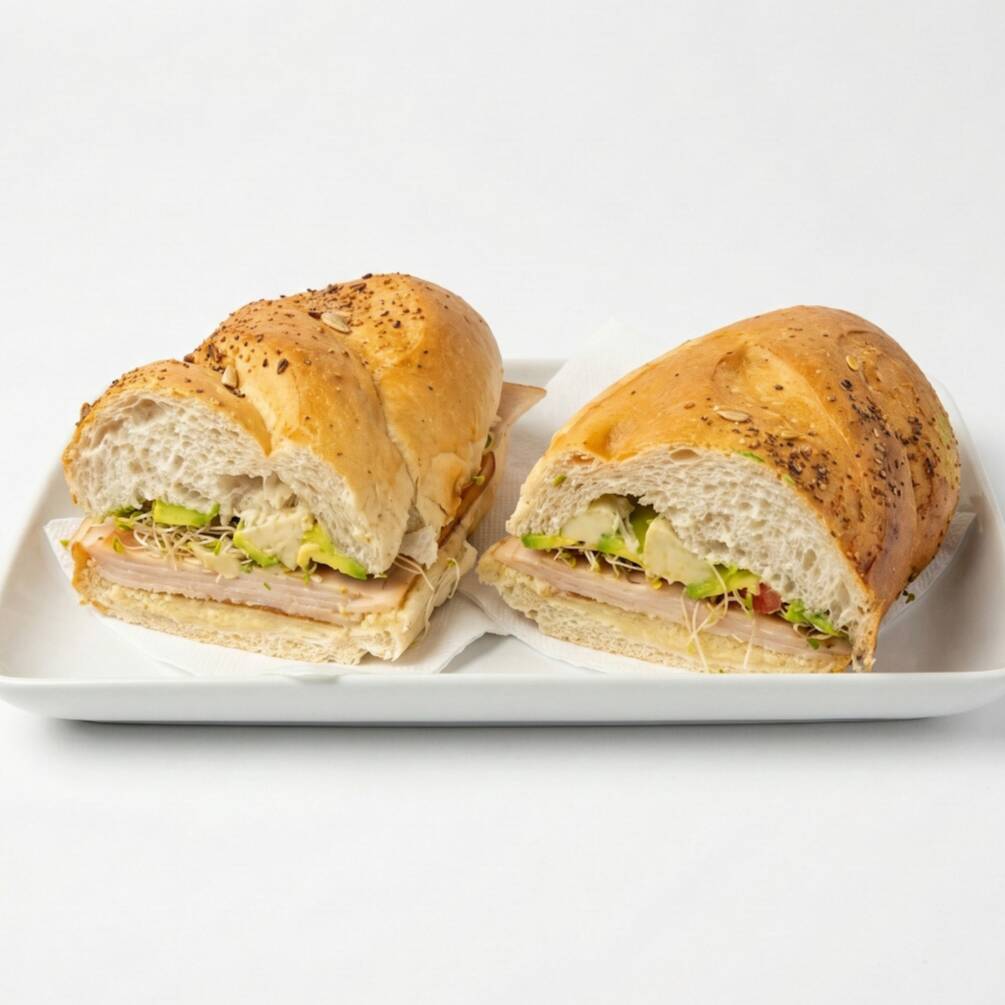 Baguette de pechuga de pavo con aguacate y verduras.