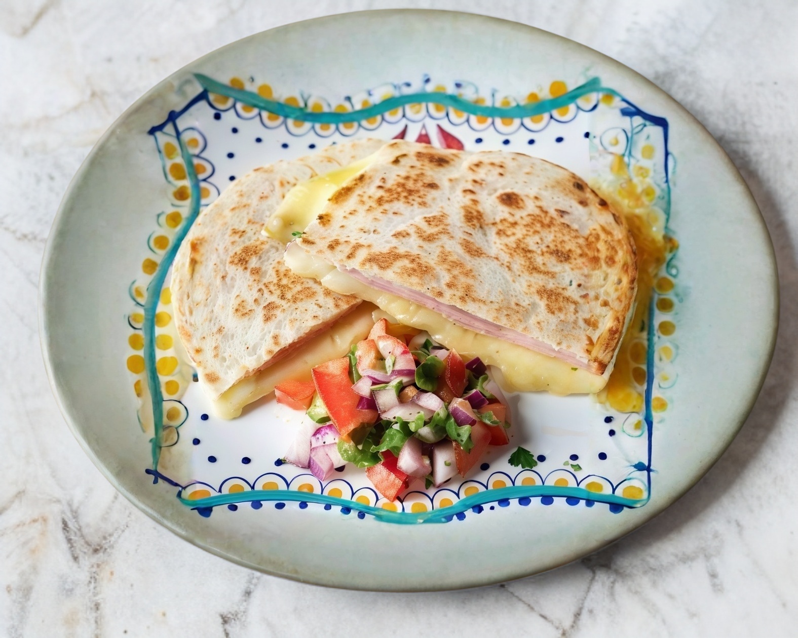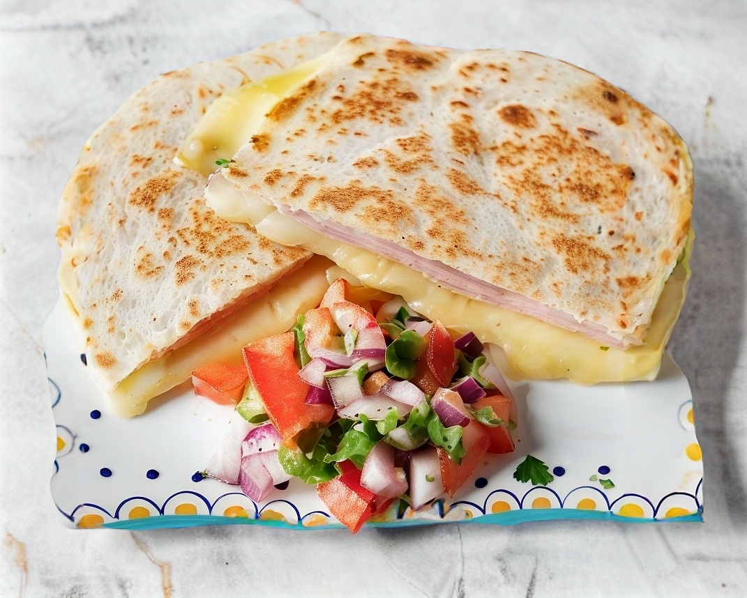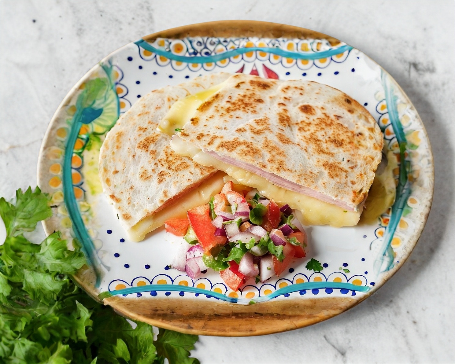 Dos tortillas de harina redondas partidas a la mitad con queso manchego y jamón. Nota: Al elegir pico de gallo, este se enviará en todos los casos con jitomate, cebolla y chile sin excepción.