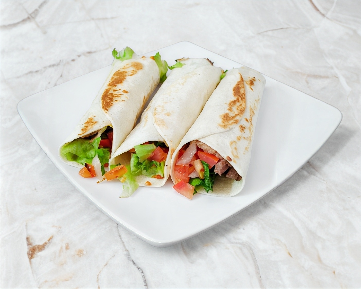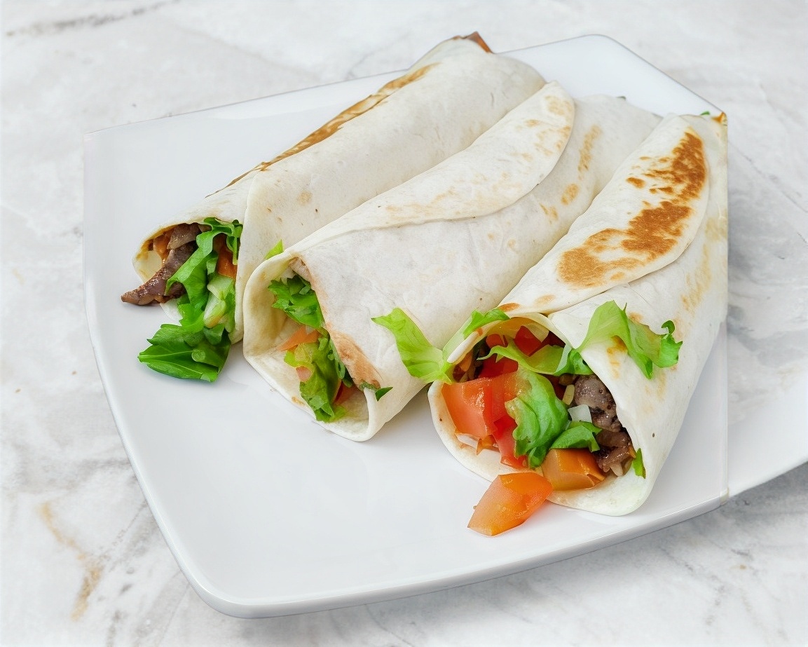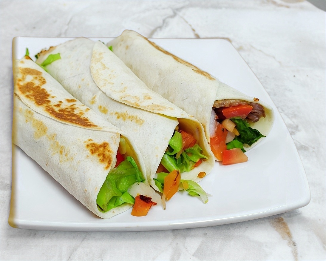 Tres burritos hechos con tortilla de harina de tamaño normal rellenos de pechuga de pollo, bistec de res, arrachera (un tipo de carne por burrito), queso manchego, frijoles, lechuga italiana y pico de gallo (ya viene preparado con jitomate, cebolla y chile).
