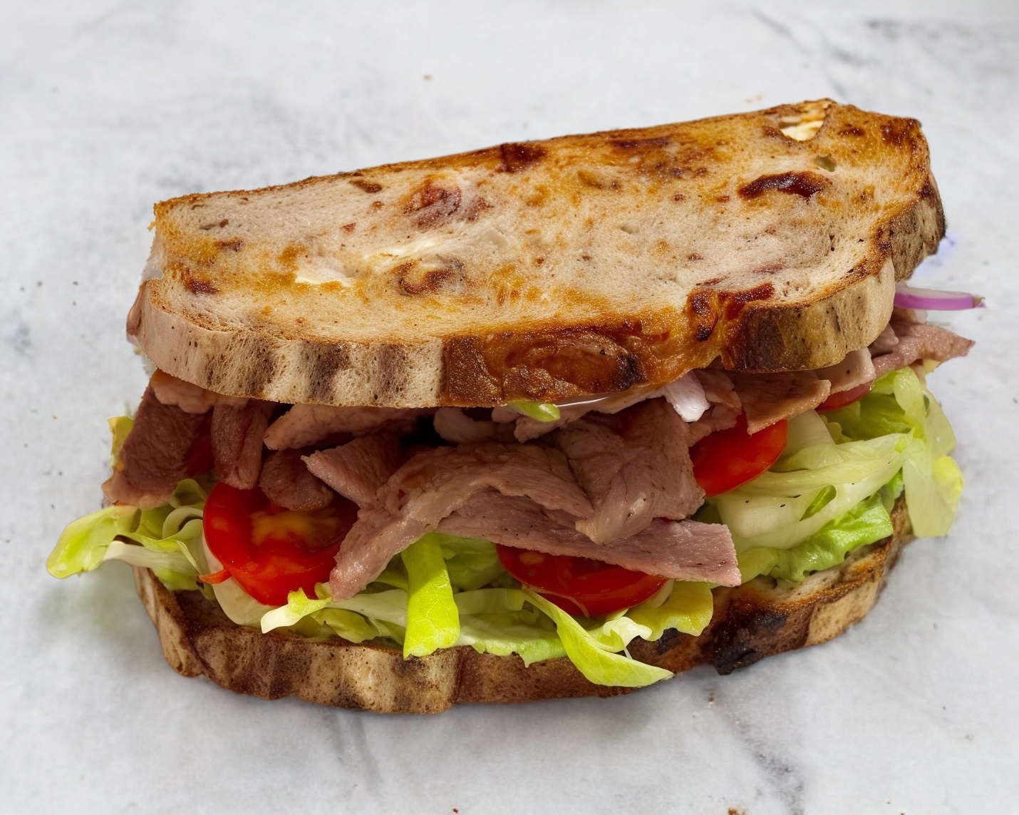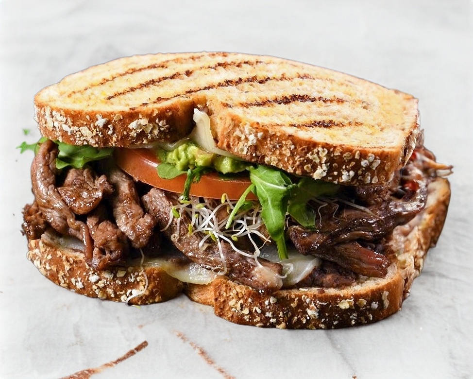 Sandwich con bistec de res 65 g, queso manchego gratinado, fresca lechuga italiana, jugoso jitomate, aguacate, mayonesa y frijoles.