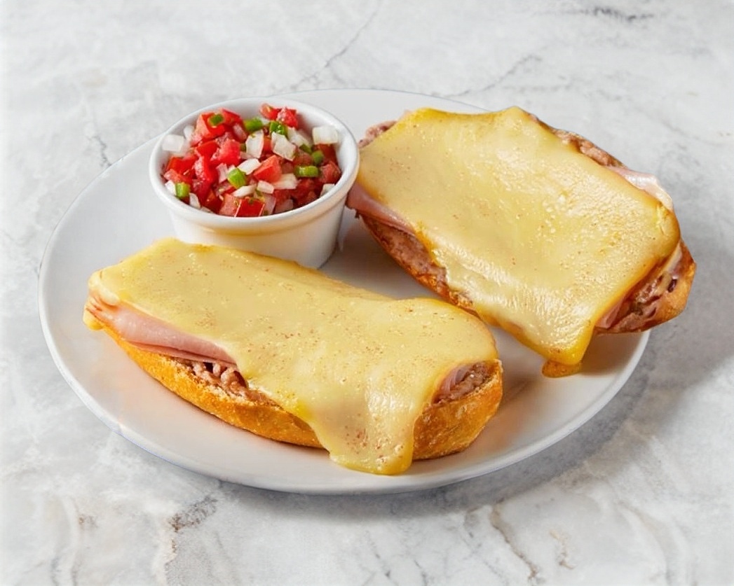 Dos piezas de molletes (2 mitades de bolillo) con jamón de pechuga de pavo, queso manchego gratinado y frijoles. Nota: Al elegir pico de gallo, este se enviará en todos los casos con jitomate, cebolla y chile sin excepción.