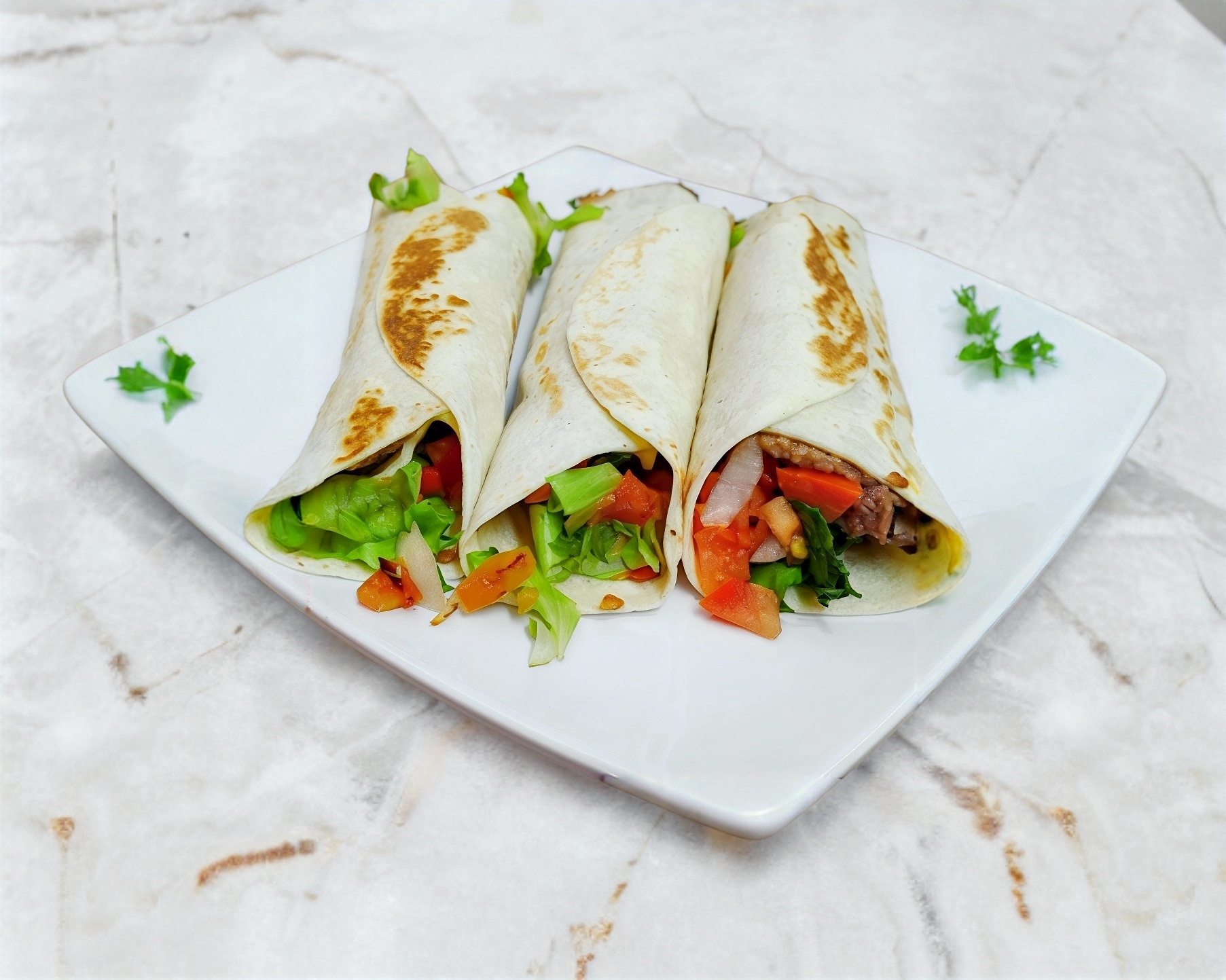 Tres burritos hechos con tortilla de harina de tamaño normal rellenos de bistec de res, queso manchego, frijoles, lechuga italiana y pico de gallo (ya viene preparado con jitomate, cebolla y chile).