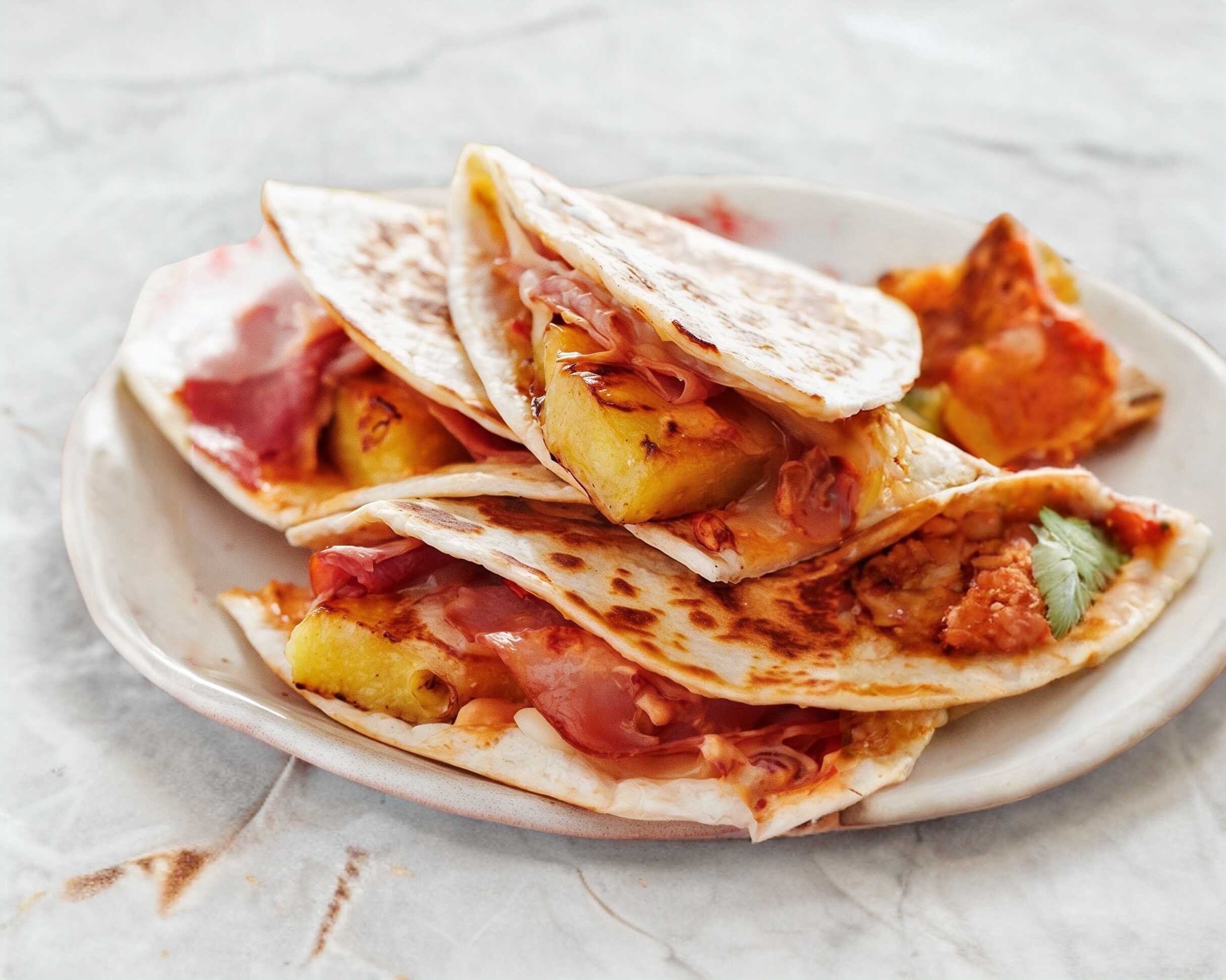 Dos tortillas de harina redondas partidas a la mitad con jamón de pechuga de pavo, piña en almibar y queso manchego. Nota: Al elegir pico de gallo, este se enviará en todos los casos con jitomate, cebolla y chile sin excepción.