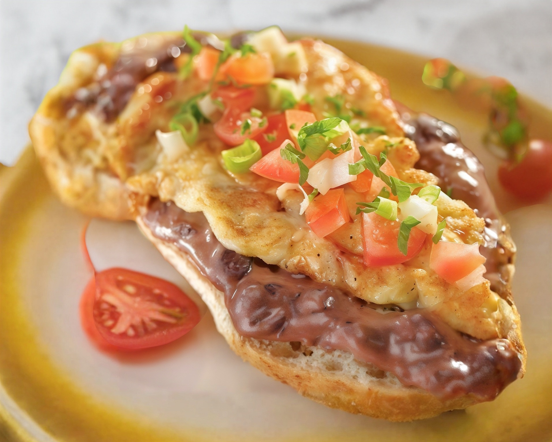Pan gourmet con huevo estrellado o revuelto, queso manchego gratinado, fresca lechuga italiana, jugoso jitomate, aguacate, mayonesa y frijoles. Nota: Al elegir pico de gallo, este se enviará en todos los casos con jitomate, cebolla y chile sin excepción.