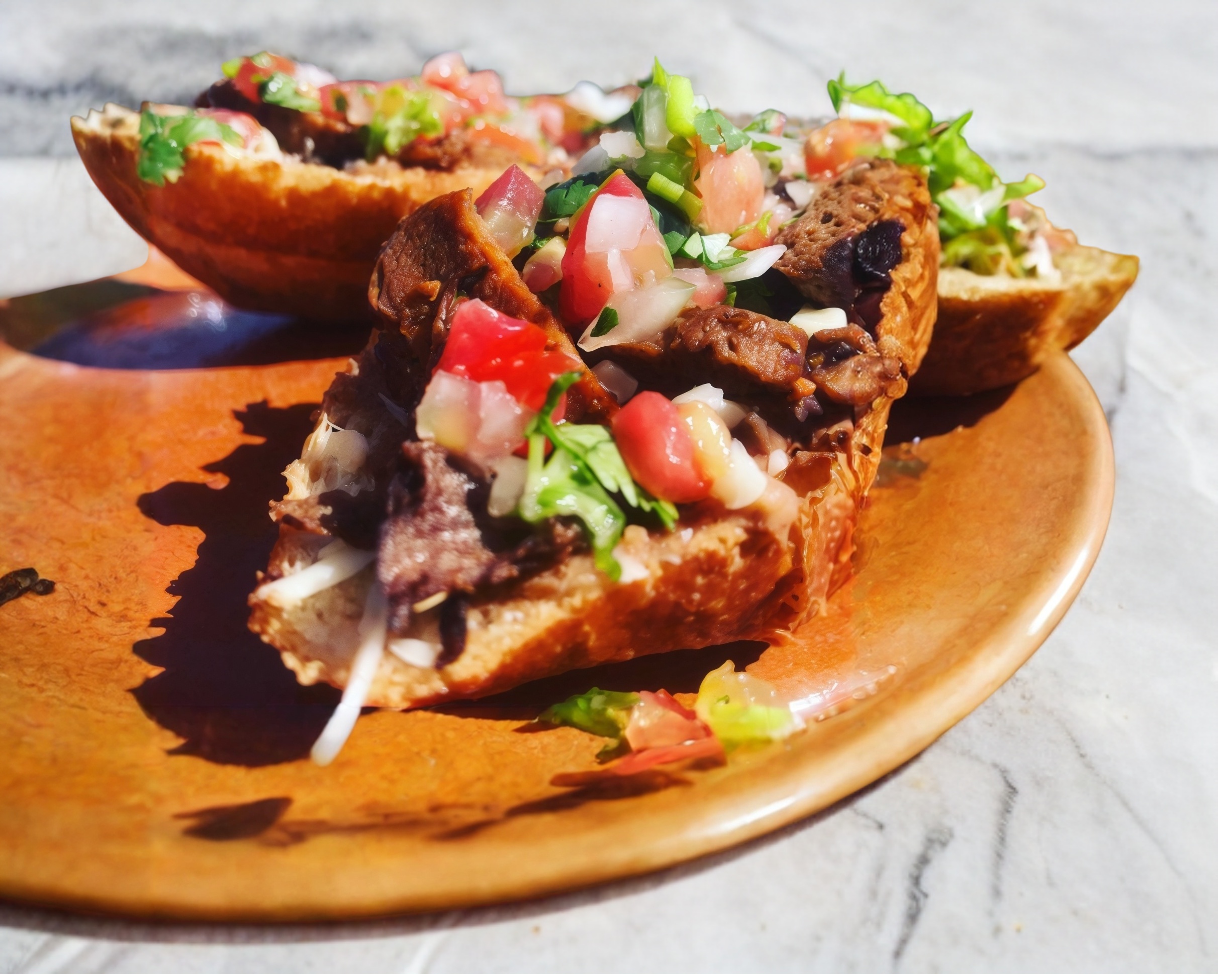 Dos tortillas de harina redondas partidas a la mitad con bistec de res y queso manchego. Nota: Al elegir pico de gallo, este se enviará en todos los casos con jitomate, cebolla y chile sin excepción.