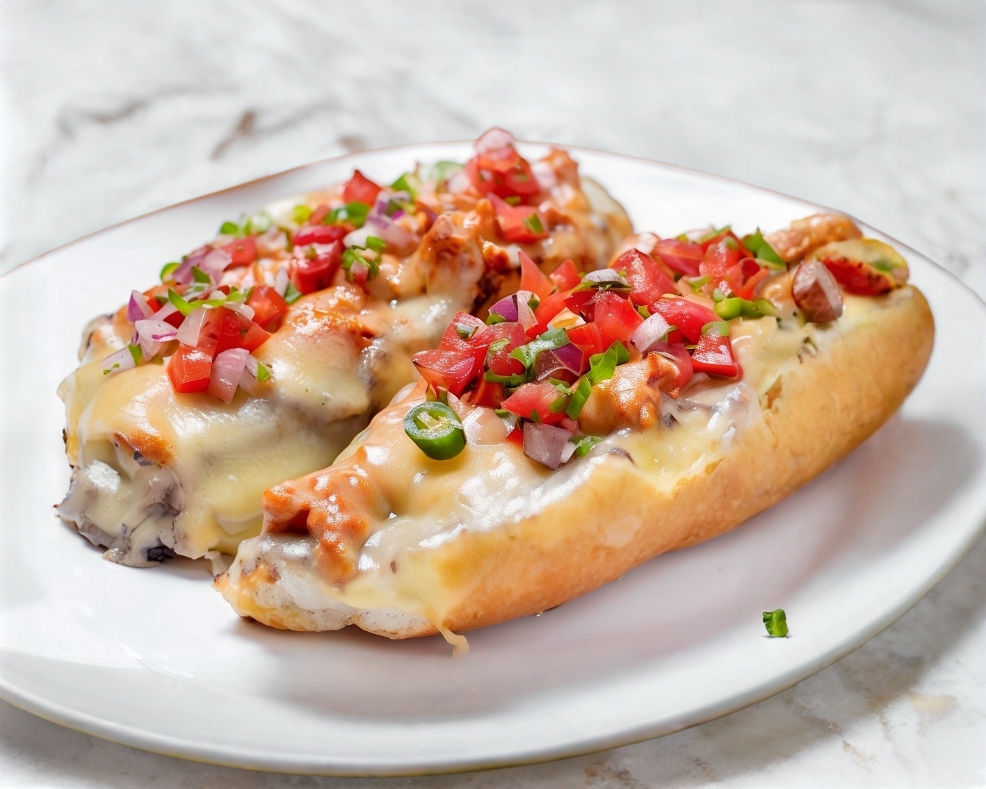 Dos piezas de molletes (2 mitades de bolillo) con pechuga de pollo asada, queso manchego gratinado y frijoles. Nota: Al elegir pico de gallo, este se enviará en todos los casos con jitomate, cebolla y chile sin excepción.