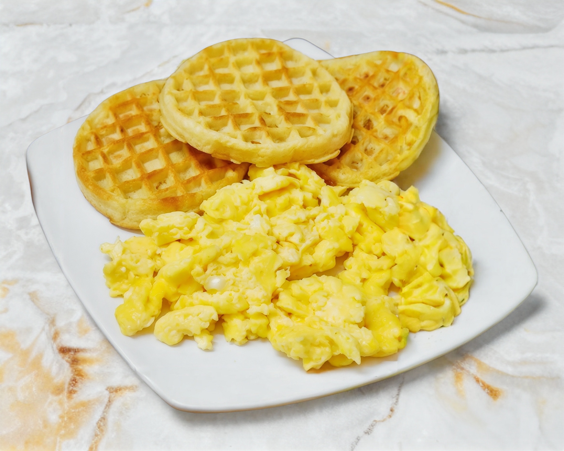 Delicioso waffle (3 piezas medianas) con 2 huevo estrellados o revueltos y miel de maple