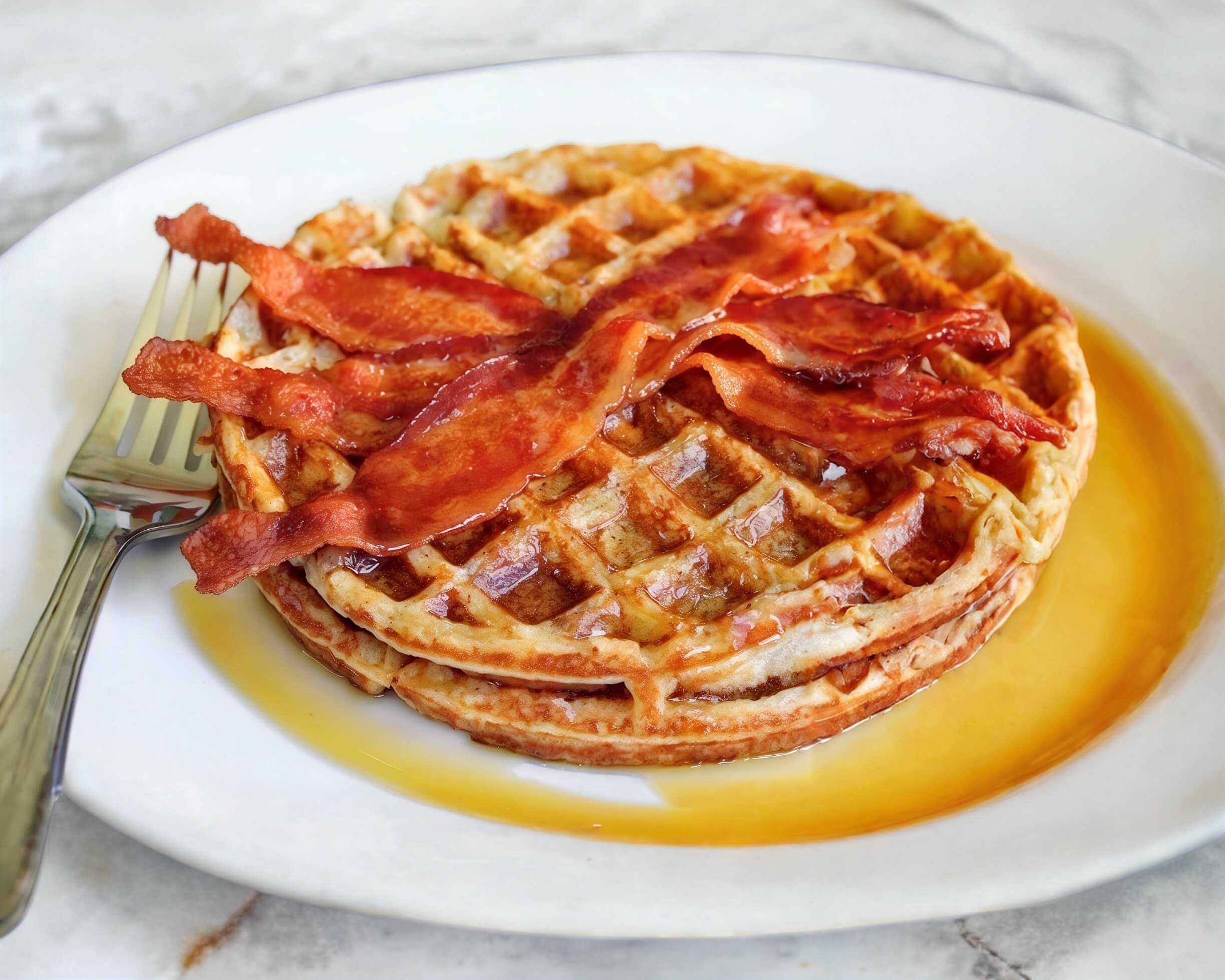 Delicioso waffle (3 piezas medianas) con 2 piezas de tocino y miel de maple.