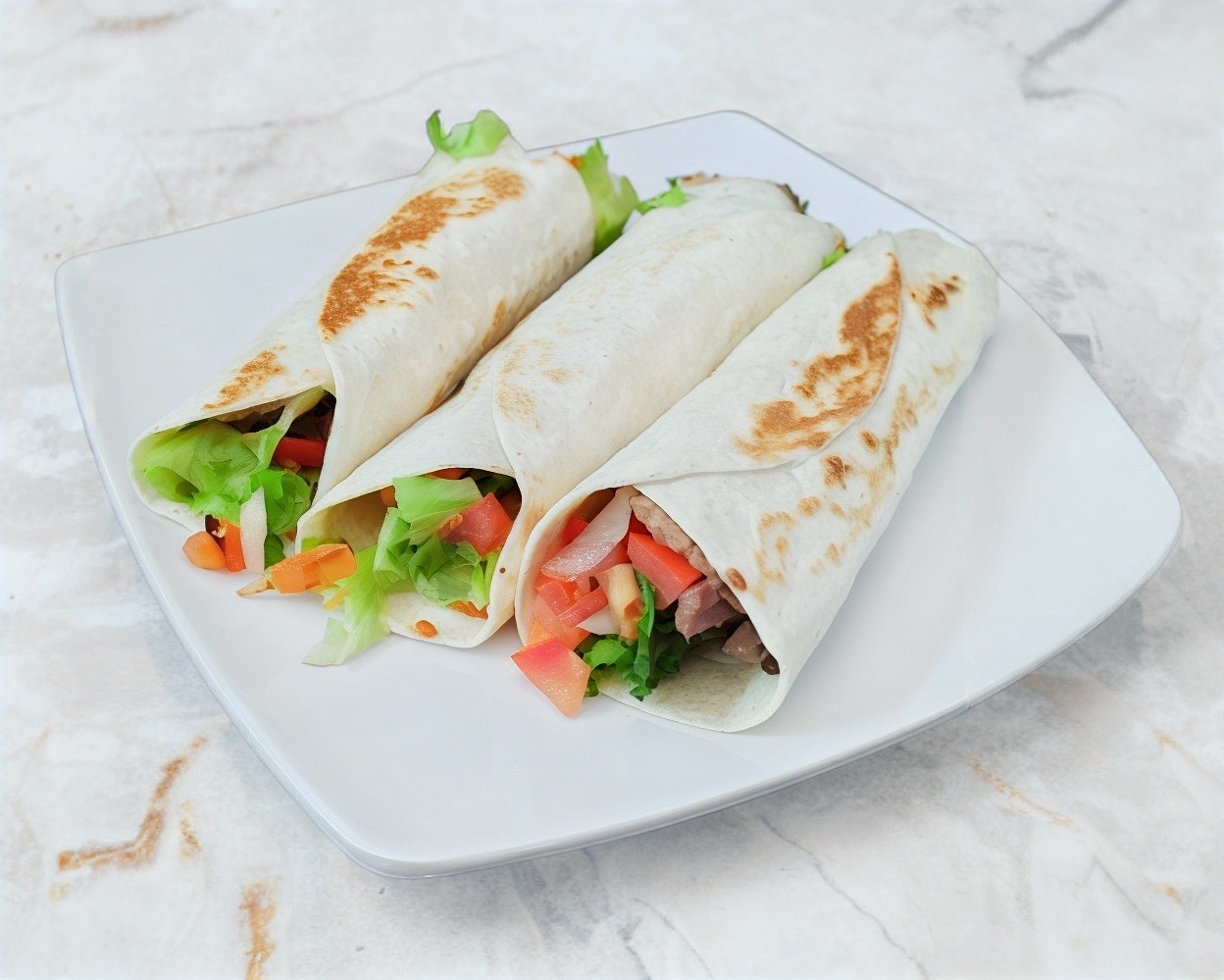 Tres burritos hechos con tortilla de harina de tamaño normal rellenos de pechuga de pollo, queso manchego, frijoles, lechuga italiana y pico de gallo (ya viene preparado con jitomate, cebolla y chile)