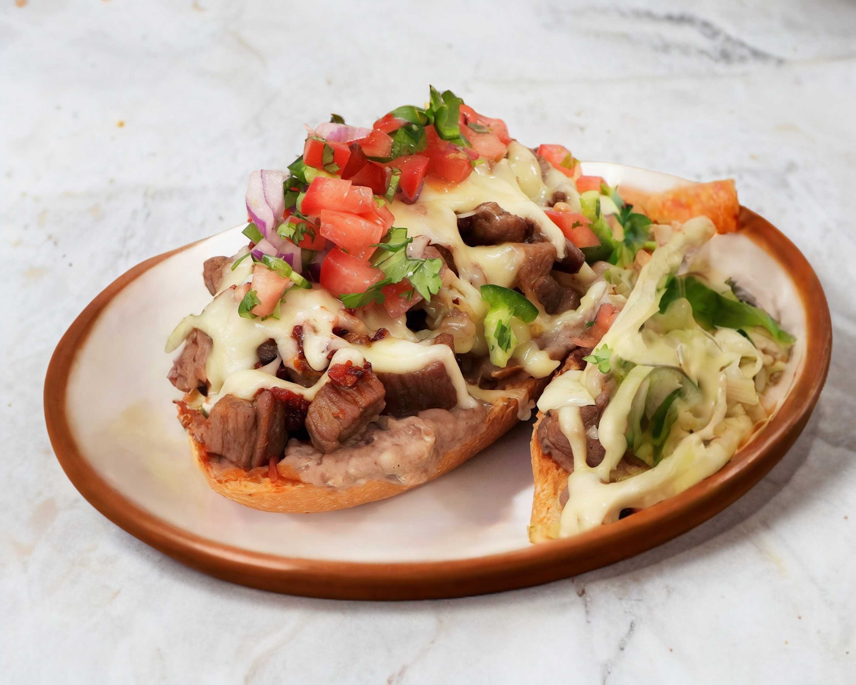 Cuernito con bistec de res, queso manchego gratinado, fresca lechuga italiana, jugoso jitomate, aguacate, mayonesa y frijoles. Nota: Al elegir pico de gallo, este se enviará en todos los casos con jitomate, cebolla y chile sin excepción.