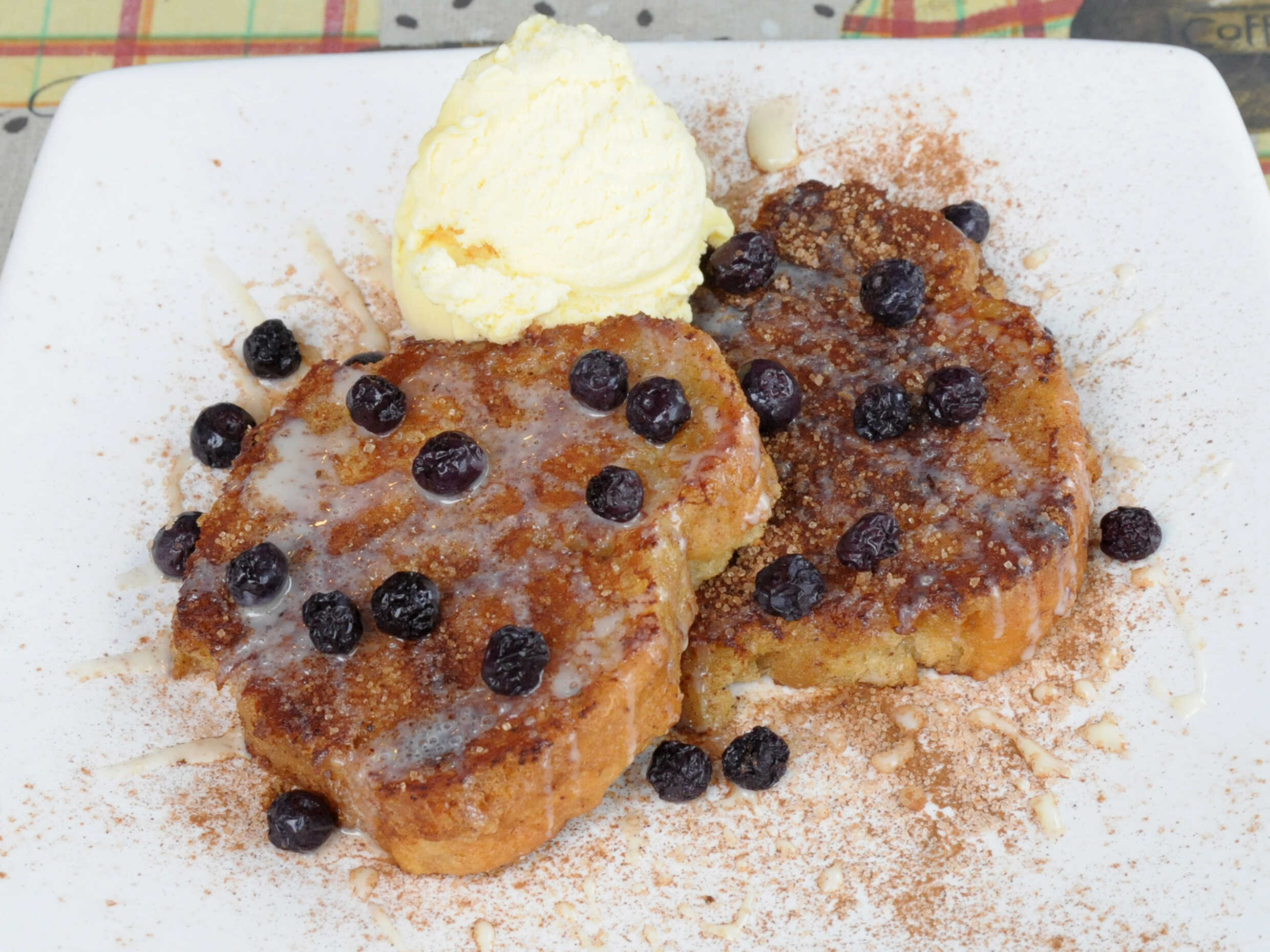 Delicioso pan de elote con un toque rompope y una bola de helado sabor vainilla.