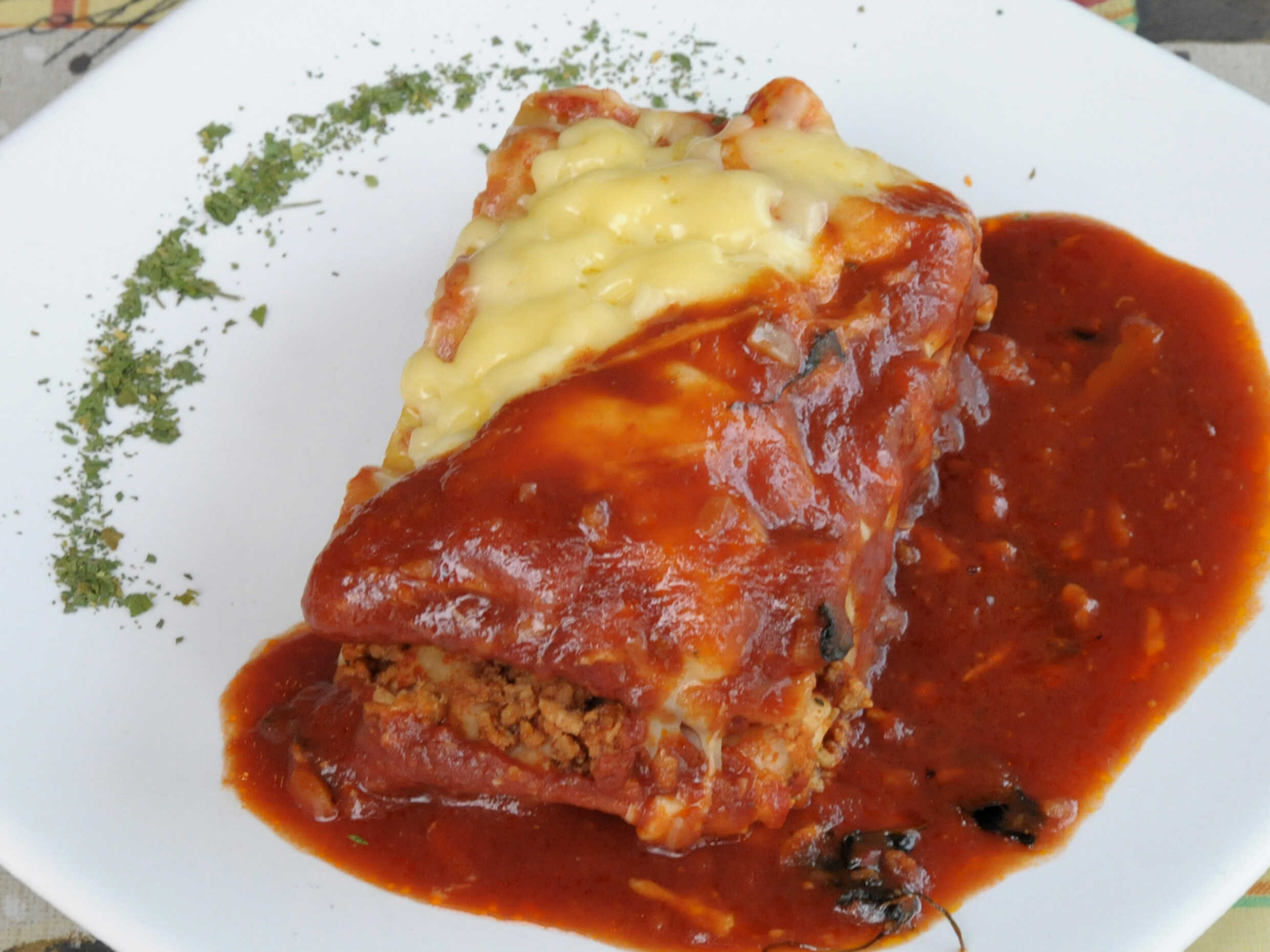 Deliciosas tortillas rellenas de pollo, bañadas con la singular salsa roja, bañadas con crema y un toque de queso y aros de cebolla.