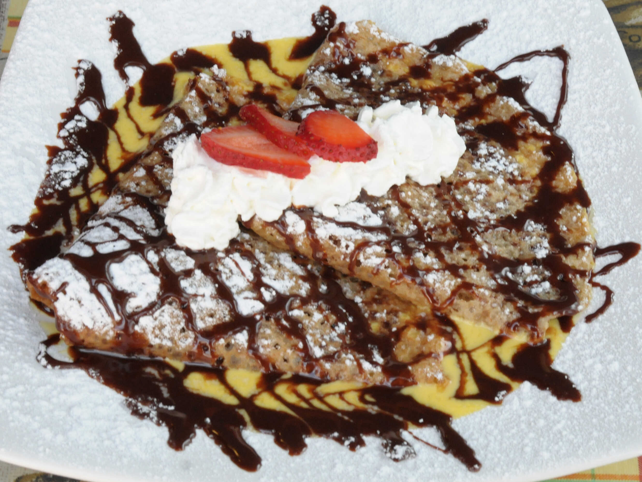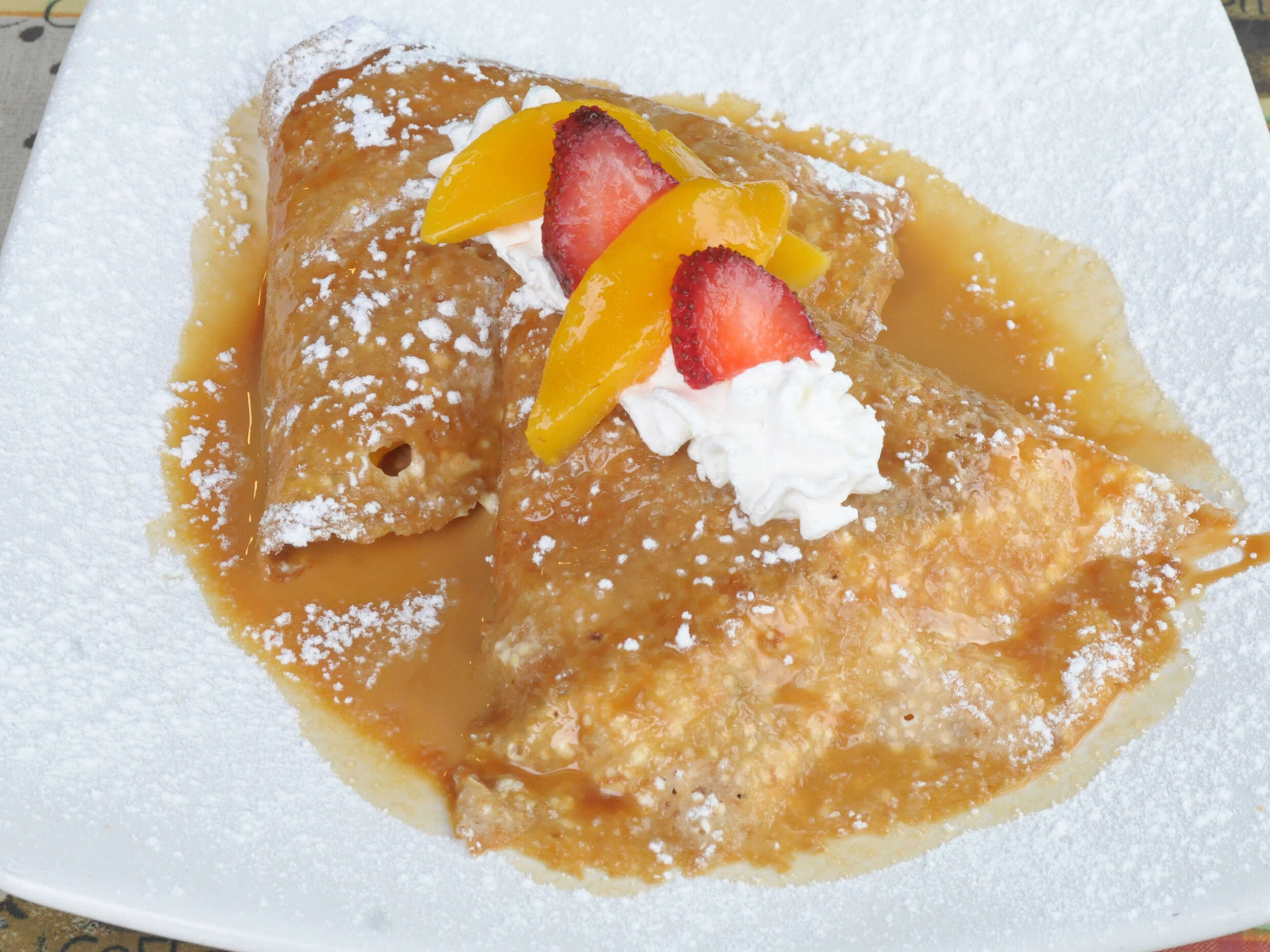 Mango, fresa, queso, bañada en salsa de cajeta.