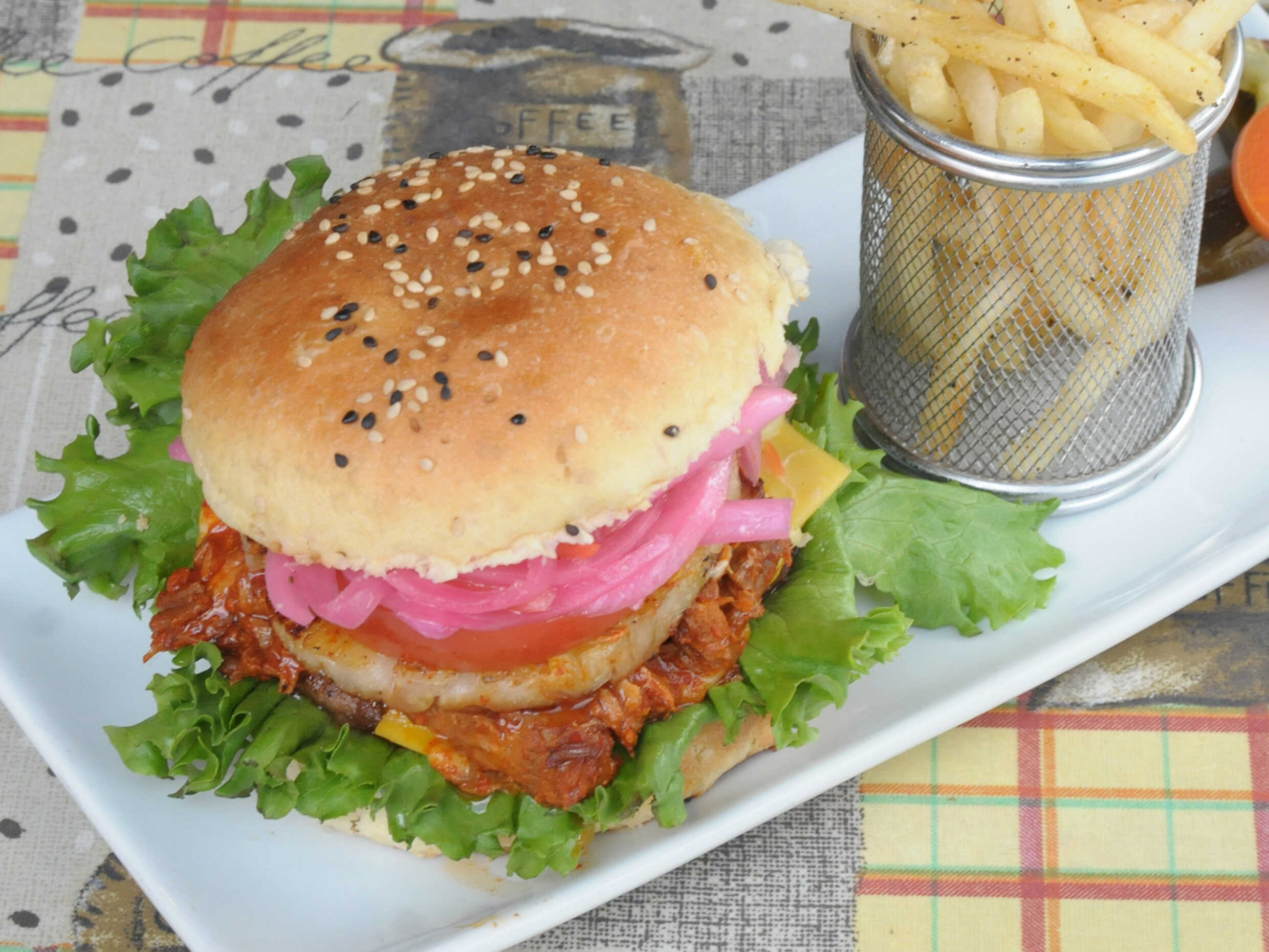 Exquisita cochinita pibil,montada en nuestro pan artesanal con queso gouda, y sus inseparables cebollas moradas con habanero, lechuga,jitomate y picante