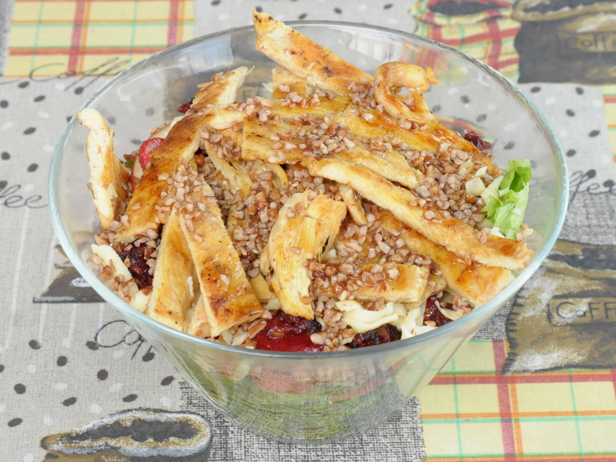 Lechuga, fresa, manzana, arándano, tiras de pollo, nuez, queso mozzarella.