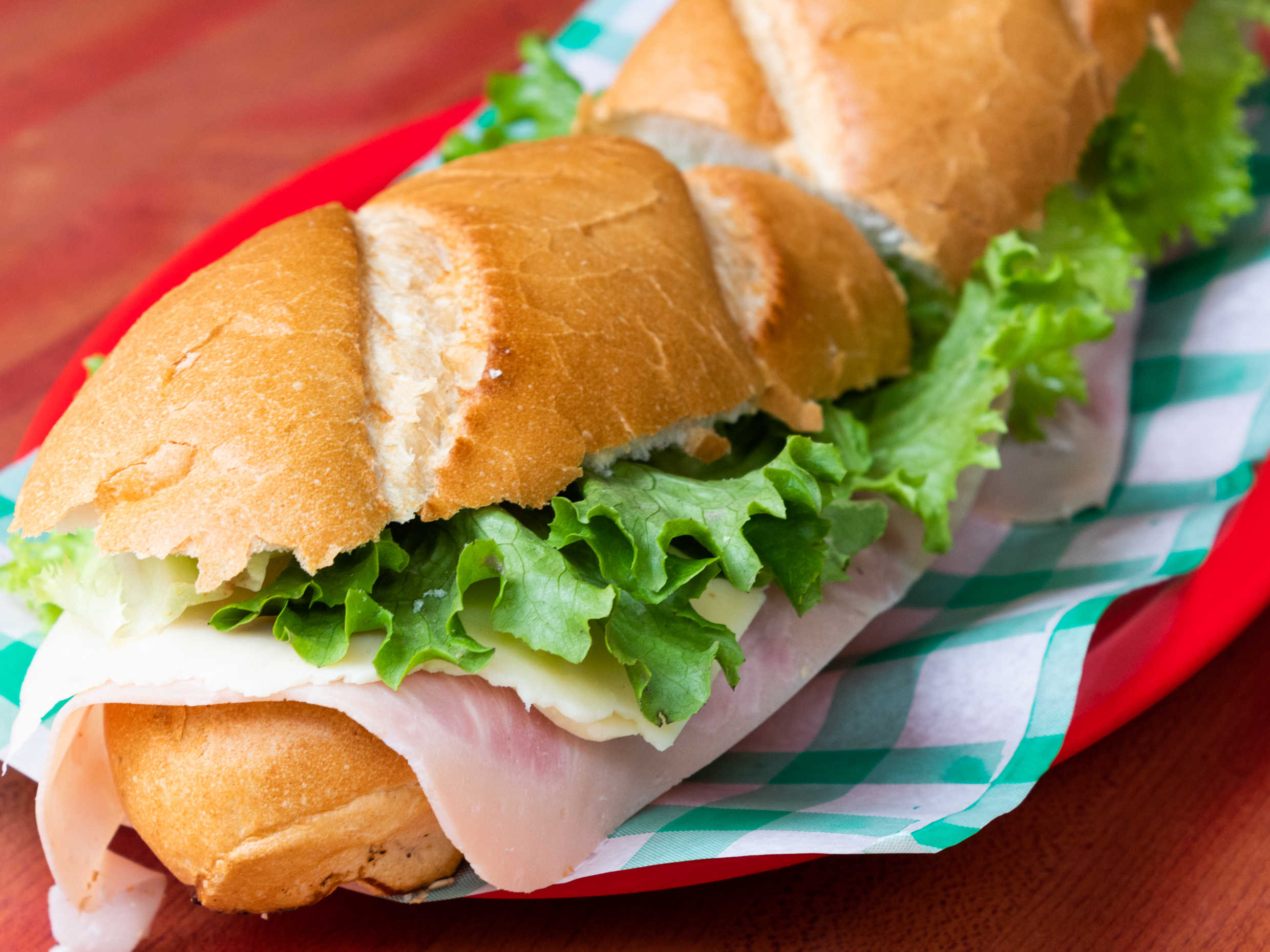 Baguette de pechuga de pavo con queso Pamela con lechuga, jitomate, y aguacate